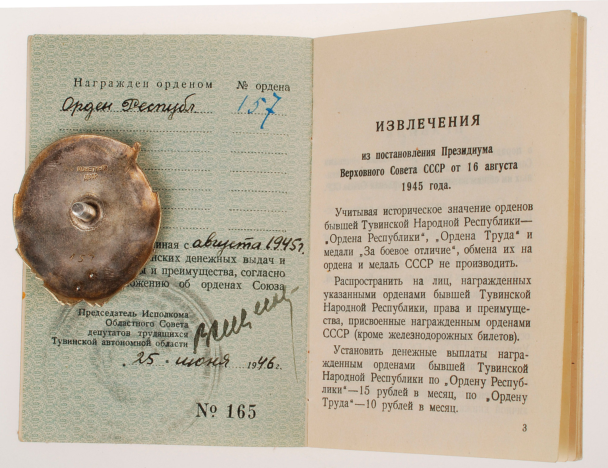 В ответе тувинскому правительству указывалось на исключительное право советского правительства на ордена СССР и содержался совет позаботиться о создании собственных знаков отличия, отражающих особенности Тувы.