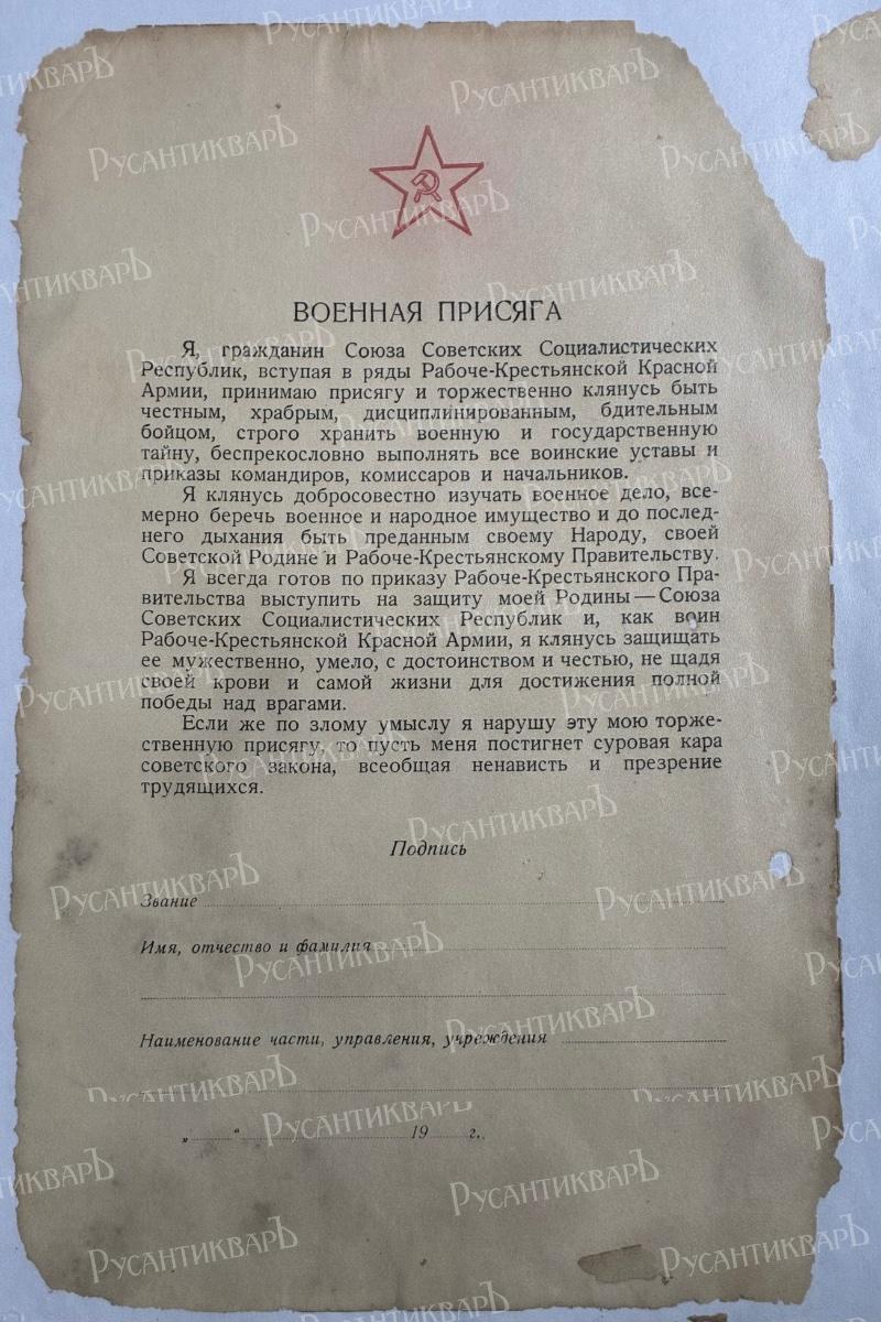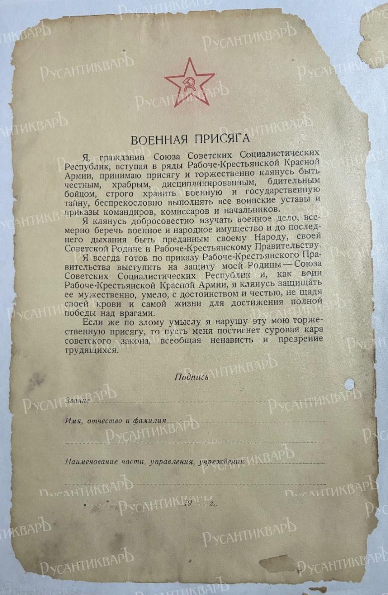 Я клянусь добросовестно изучать военное дело, все-мерно беречь военное и народное имущество и до послед-него дыхания быть преданным своему Народу, своей Советской Родине и Рабоче-Крестьянскому Правительству Я всегда готов по приказу Рабоче-Крестьянского Правительства выступить на защиту моей Родины — Союза Советских Социалистических Республик и, как воин Рабоче-Крестьянской Красной Армии, я клянусь защищать ее мужественно, умело, с достоинством и честью, не щадя своей крови и самой жизни для достижения полной