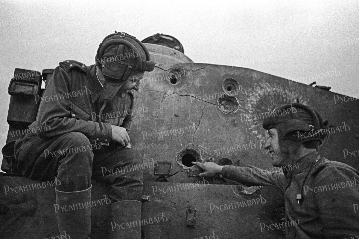 Курская дуга. Командир танка, лейтенант Б.В. Смелов показывает лейтенанту Лихнякевичу пробоину в башне немецкого танка "Тигр", подбитого экипажем Смелова, 1943 год.Эту пробоину сделал обычный бронебойный снаряд из 76-миллиметрового танкового орудия.