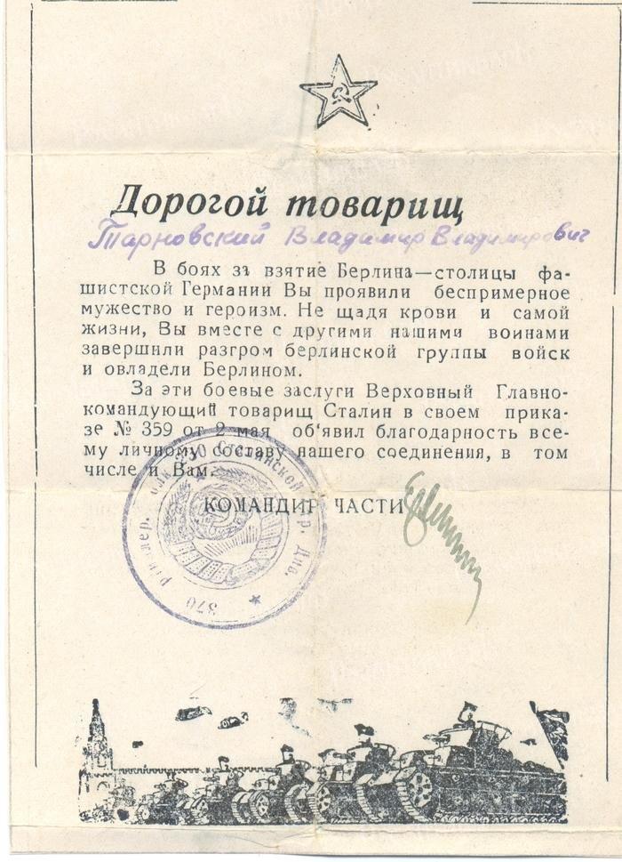 Это сын 370-го артполка Володя Тарновский. Валентин Тарновский родился летом 1930 года в городе Славянск Украинской ССР (ныне — в Донецкой области Украины). Жил с матерью и отчимом; оба работали на заводе «Красный химик». Через два дня после его одиннадцатого дня рождения началась война. Отчим сразу ушёл на фронт, где вскоре и погиб. В октябре 1941 года в город вошли немцы — маму забрали и, как и других коммунистов, расстреляли. После этой трагедии Валю приютила жена маминого брата, а младшего брата — родственники отчима.