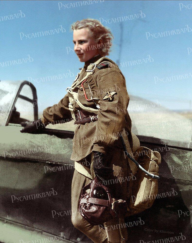 Пилот 73-го гвардейского истребительного авиаполка младший лейтенант Лидия Литвяк (1921—1943) после боевого вылета на крыле своего истребителя Як-1Б.
