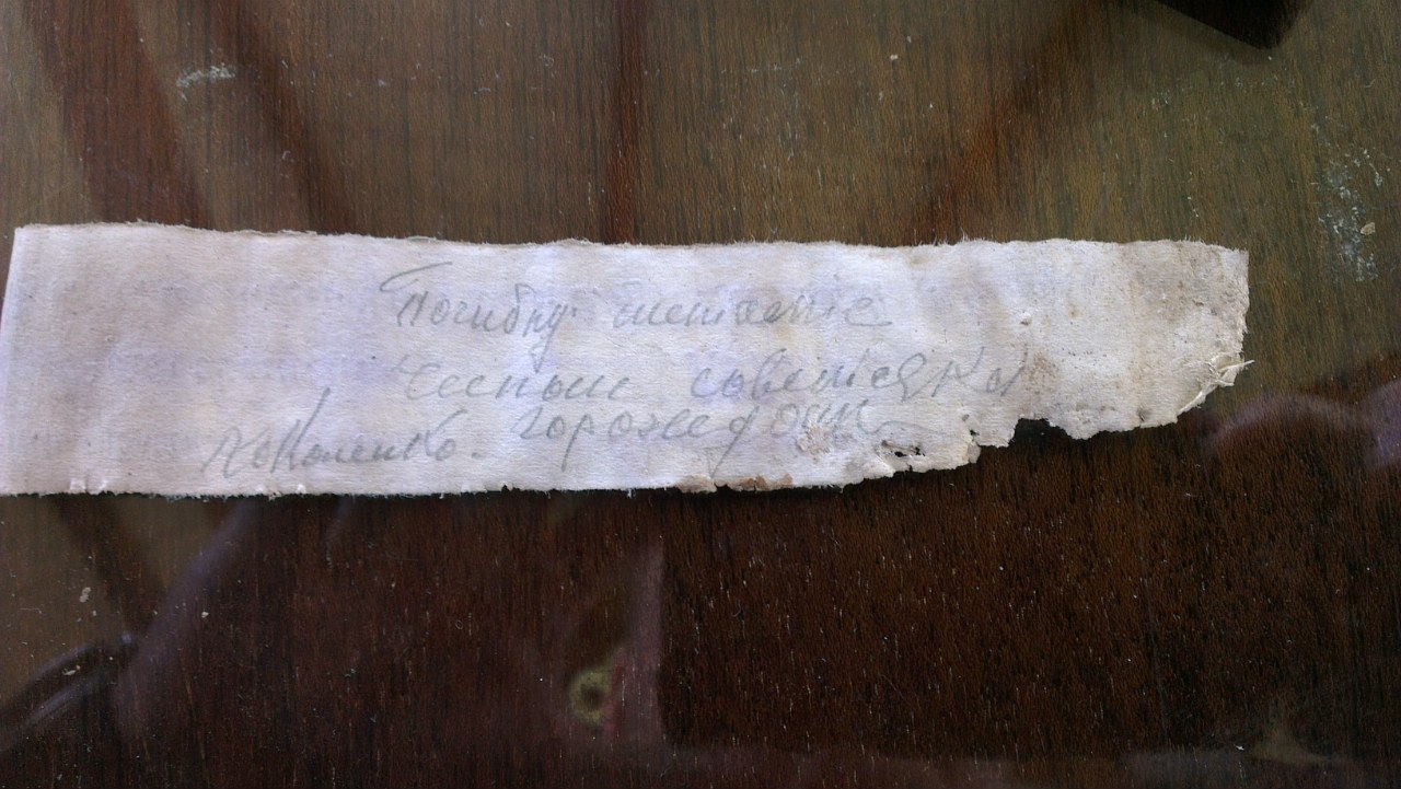 Снимая третий лопатный штык земли, мы обнаружили первую капсулу солдатского медальона, а внутри нее аккуратно заполненный бланк записки образца 1924 года с краткой припиской на обороте: «Погибну, считайте честным советским гражданином. Н. Кононенко»…