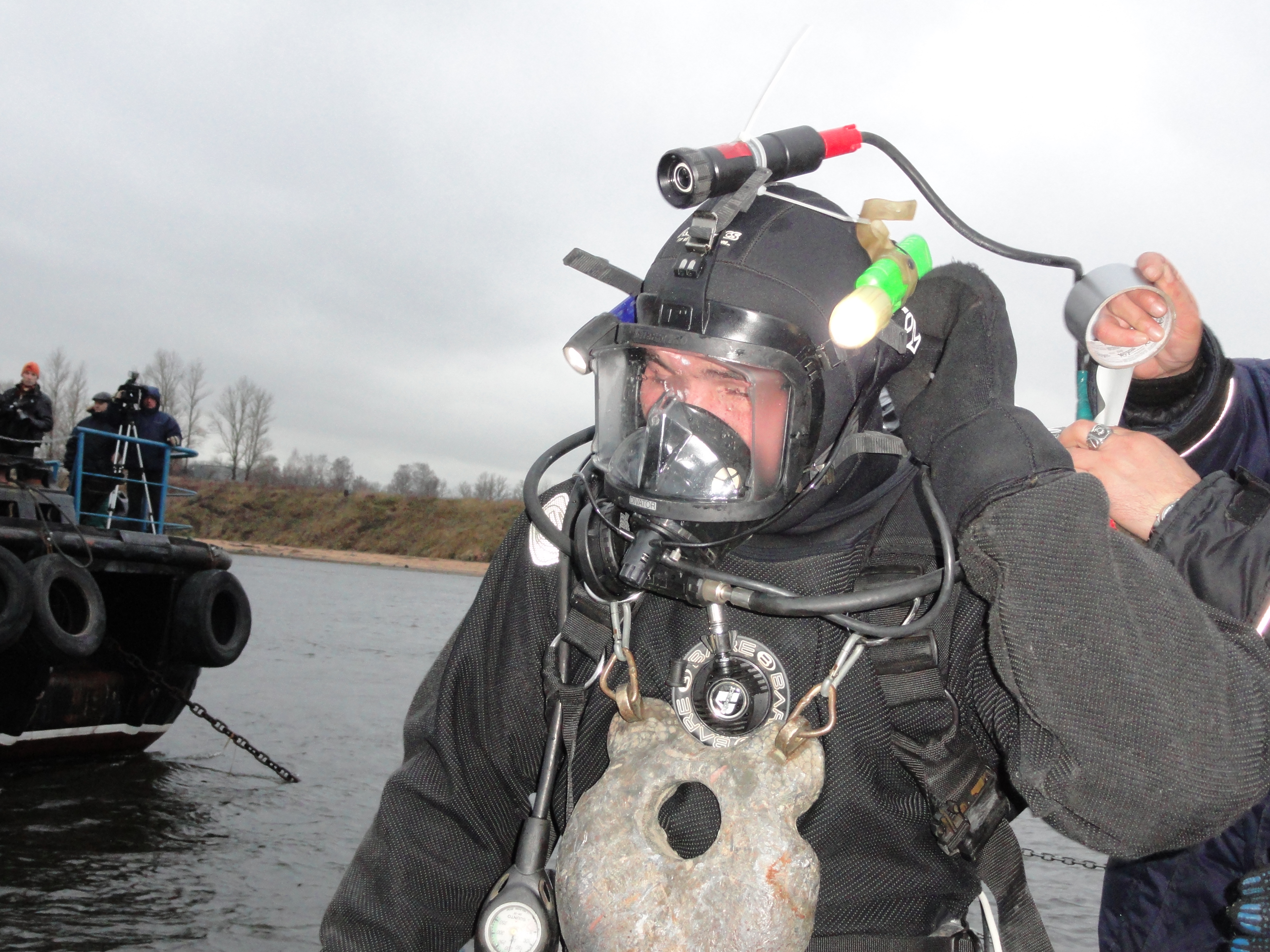 Тем временем темнело. Штормовой ветер и сильное течение продолжали препятствовать операции. Со слов Тимура, видимость под водой составляла не более метра, нужно было поторапливаться. Вскоре водолазу удалось прикрепить тросы к танку и все услышали команду «вира помалу!». Стропы медленно полезли вверх. Не смотря на грозные окрики руководителя экспедиции соблюдать технику безопасности и отойти от бортов – тросы могли запросто оборваться, журналисты буквально повисли на леерах, нацеливая объективы камер на темные воды Невы, в надежде запечатлеть первые мгновения появления танка.