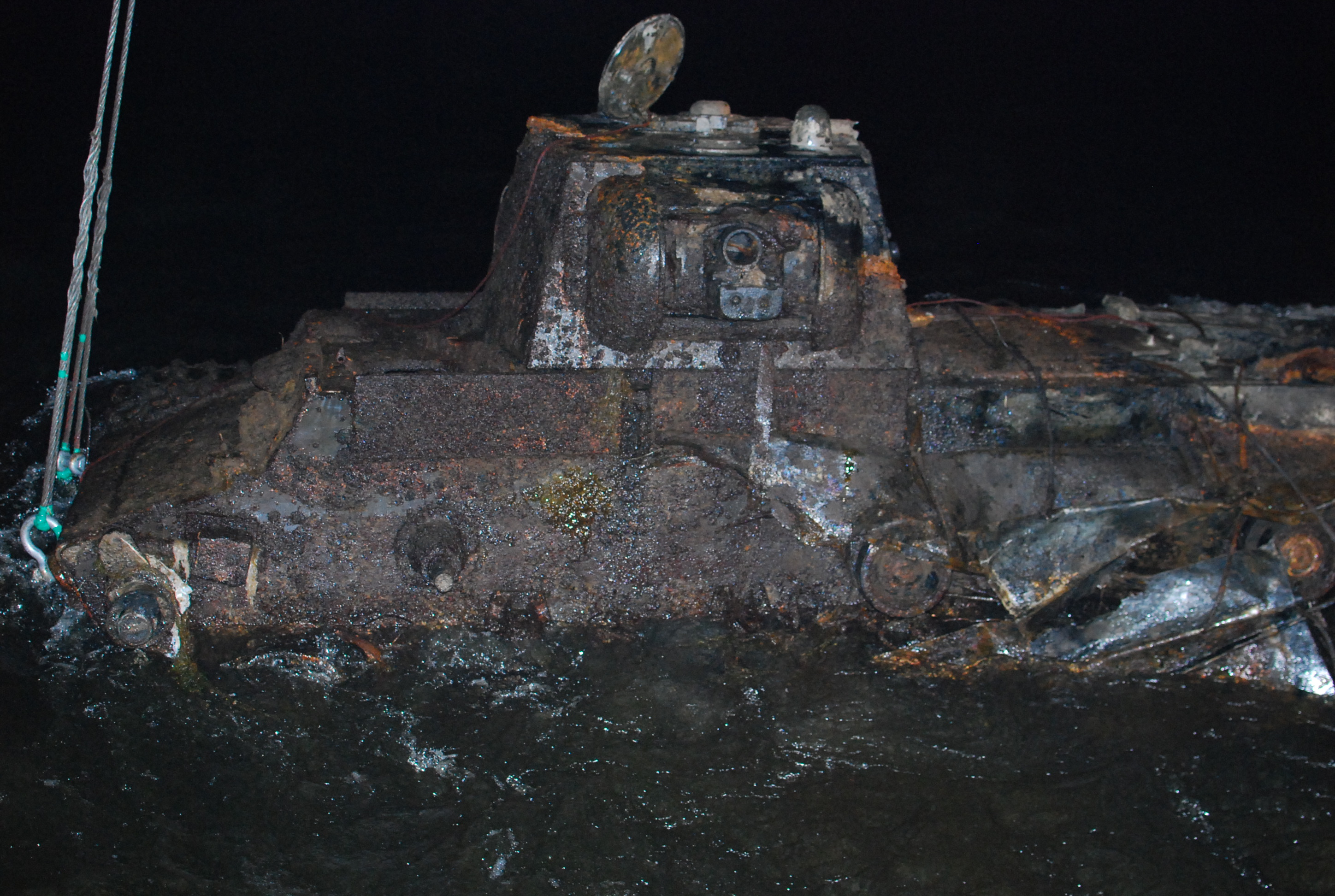 Внезапно, сильным течением танк развернуло и поставило на бок, и все увидели, что два троса провисли, а другие два очень сильно натянулись. Подъем сразу остановили, а спустившийся к танку водолаз сообщил, что машина держится только на двух стропах, в то время как две другие закусило – сильное течение очень мешает работе.