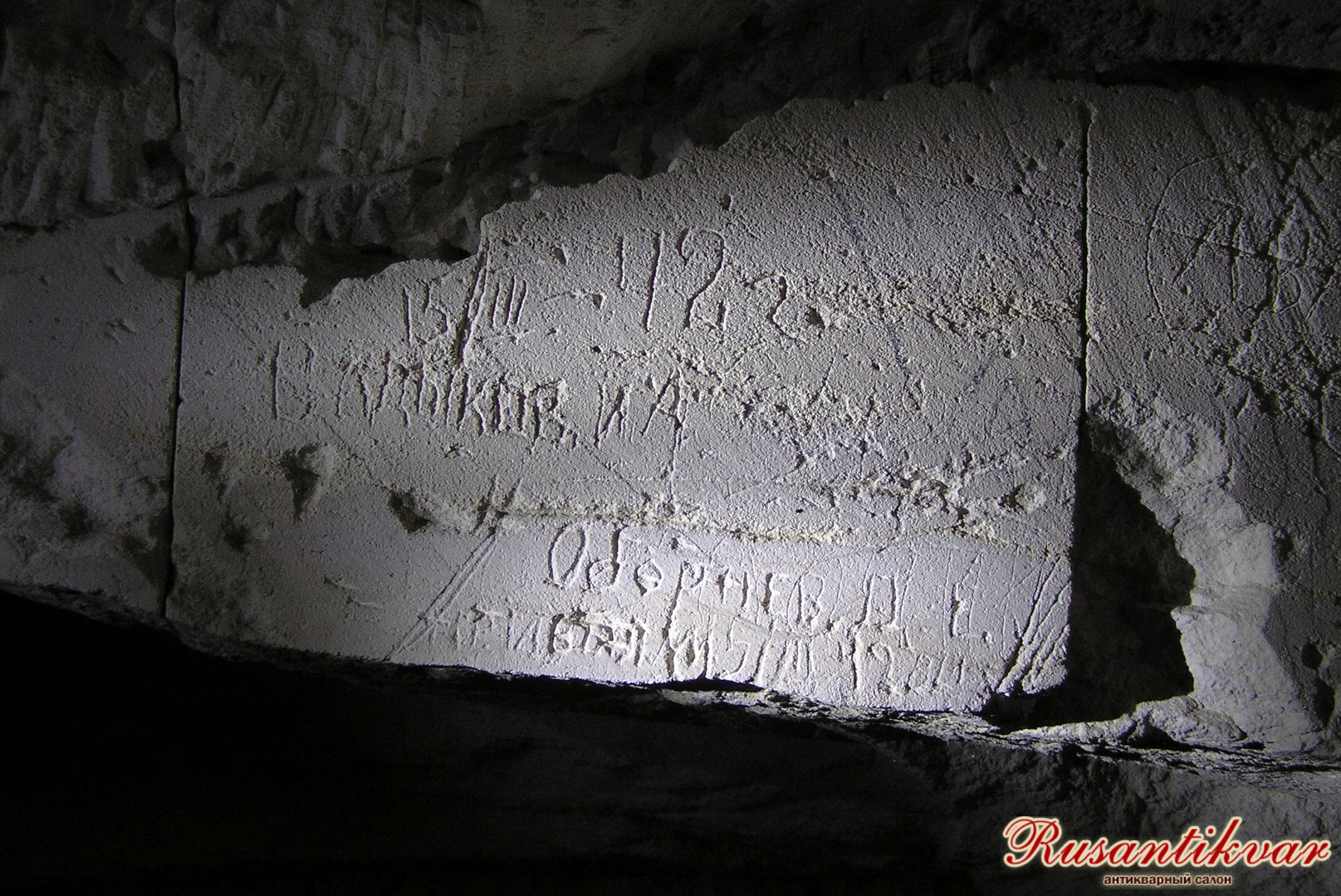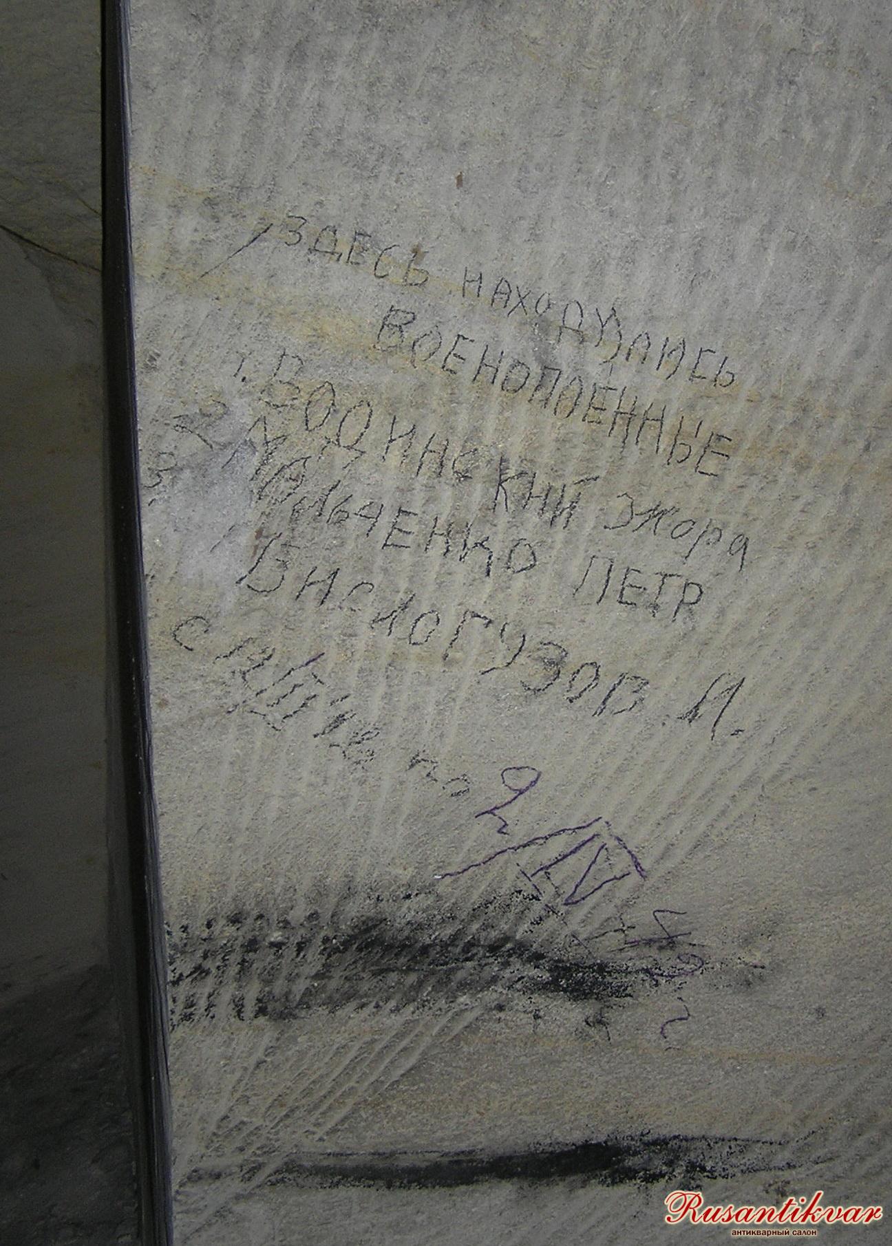 Но это были не единственные следы пребывания здесь военнослужащих, проходивших проверку. На одном из участков каменоломен удалось найти несколько надписей процарапанных на стенах и карнизах: «Гончар П.Г. прибыл 18/III-42», «Садыков И.А. 12/III-42 г.», «15/III-42 г. Садыков И.А.», «Оборнев Д.Е. прибыл 15/III-42», «Бондаренко Д.М. прибыл 15/III-42», «Кисеев А.Д. прибыл 22/III-42 г.», судя по датам, относившихся к интересующему нас эпизоду. А чуть в стороне и еще одну, написанную углем, явно указывающую, что мы действительно нашли, то, что искали: