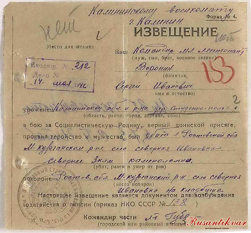 3. Извещение о гибели С.И. Воронина, май 1942 года.