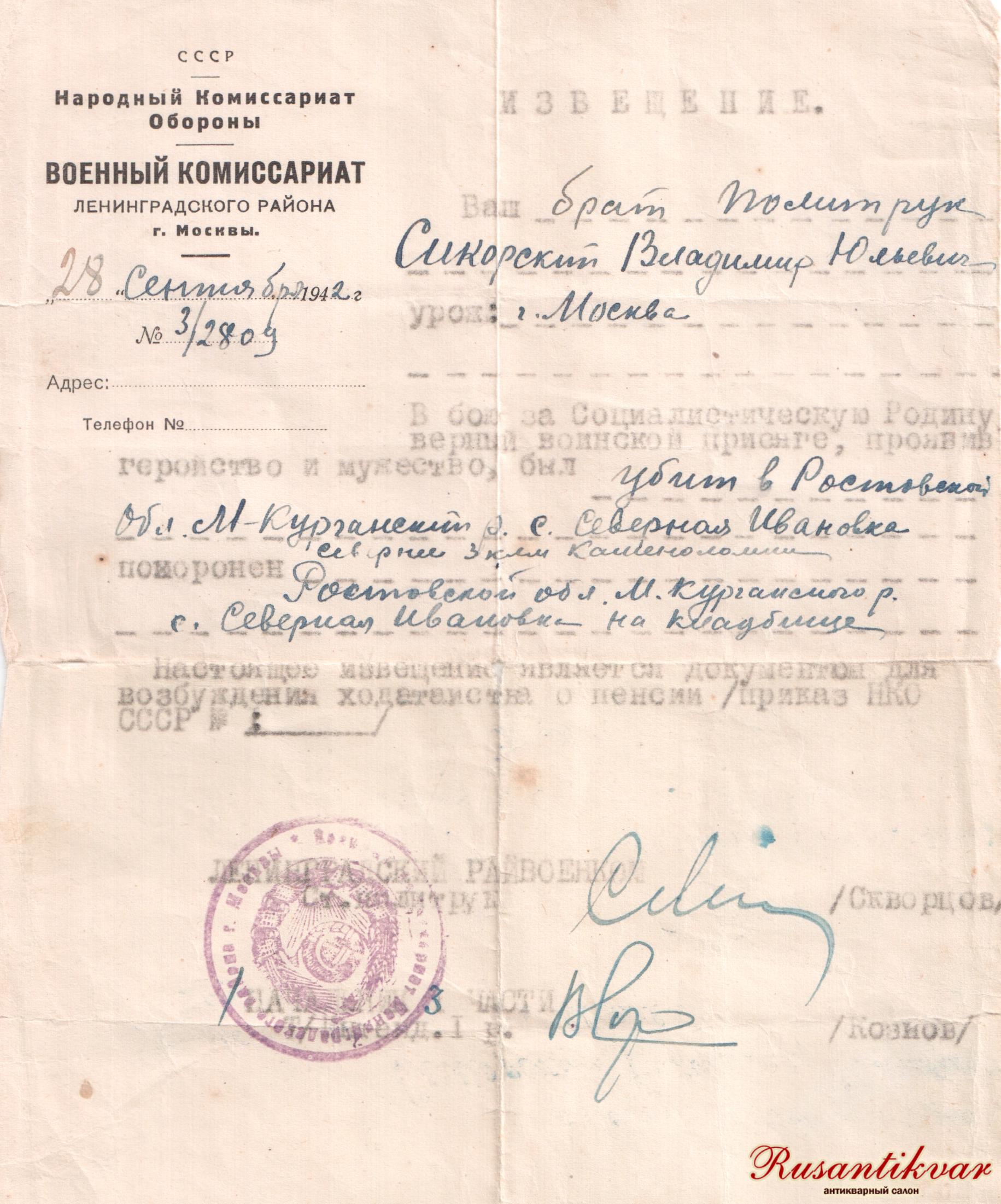2. Извещение о гибели В.Ю. Сикорского, сентябрь 1942 года.