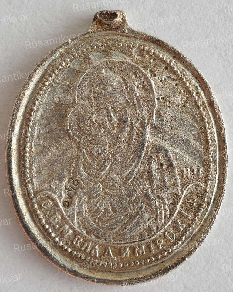 Икона овальная, двусторонняя. На лицевой стороне поясное изображение Богоматери с младенцем. По нижнему краю надпись: «О.Б.М. ВЛАДИМIРСКIЯ». На оборотной стороне поясное изображение Тихона Калужского в мантии и схиме, с чётками в правой руке и свитком - в левой. По окружности надпись: «ОБР. ПРЕПОДОБ. ТИХОНЪ КАЛУЖСКIЙ ЧУДОТВОР.».