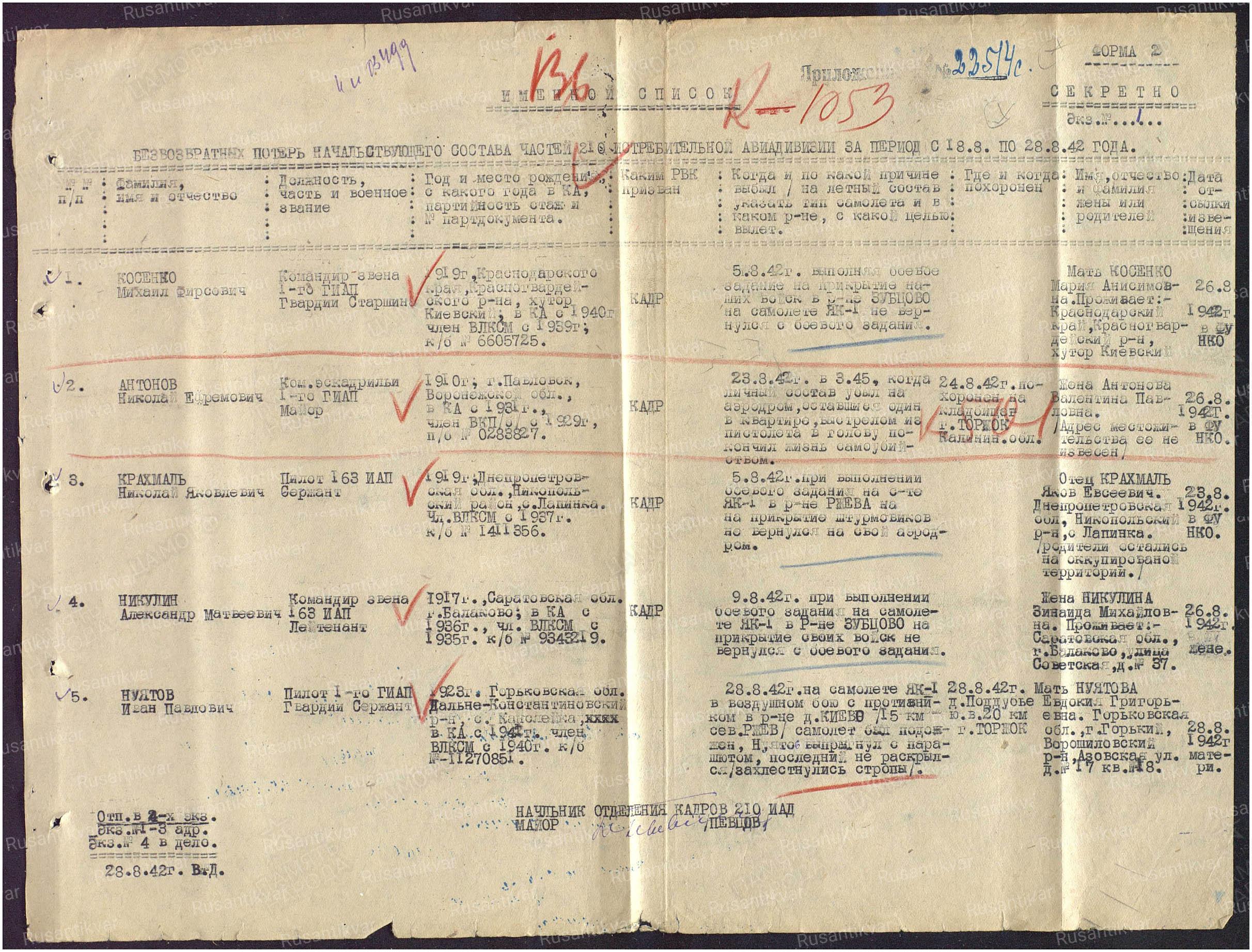4. Именной список безвозвратных потерь 210-й ИАД с информацией по Н.Я. Крохмалю.