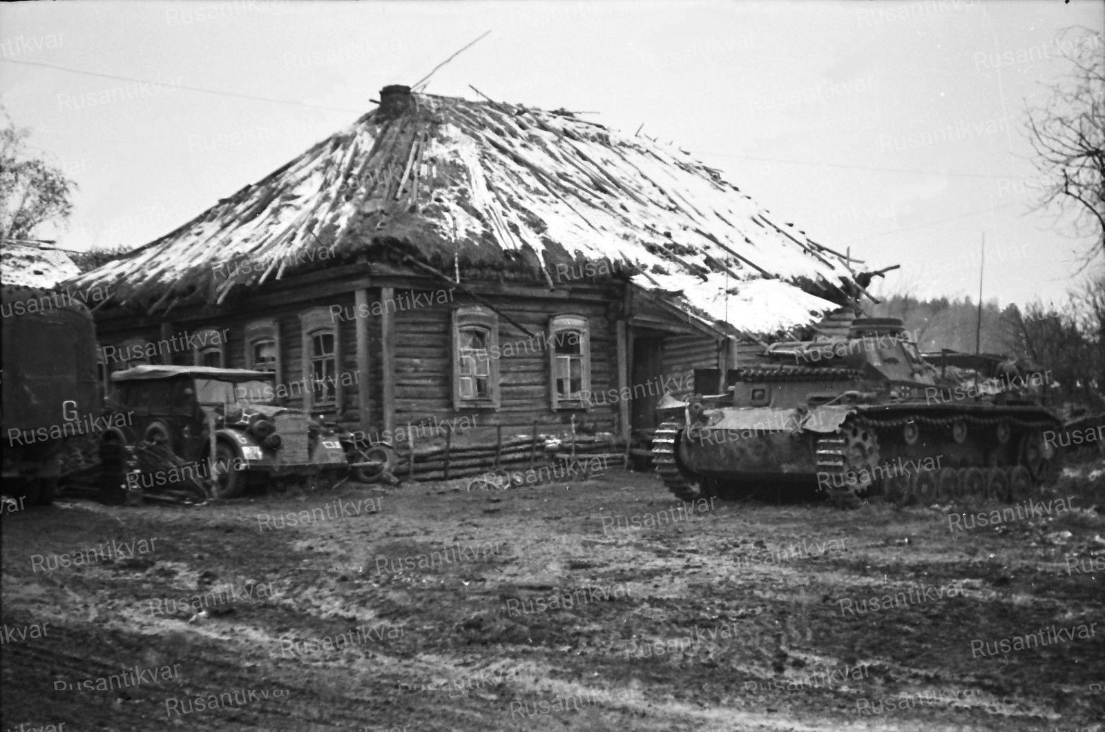6. Техника 10-й танковой дивизии вермахта на Скирмановском плацдарме. На левом крыле по ходу движения у припаркованной у дома машины виден опознавательный знак 10-й танковой дивизии – «Буйвол».