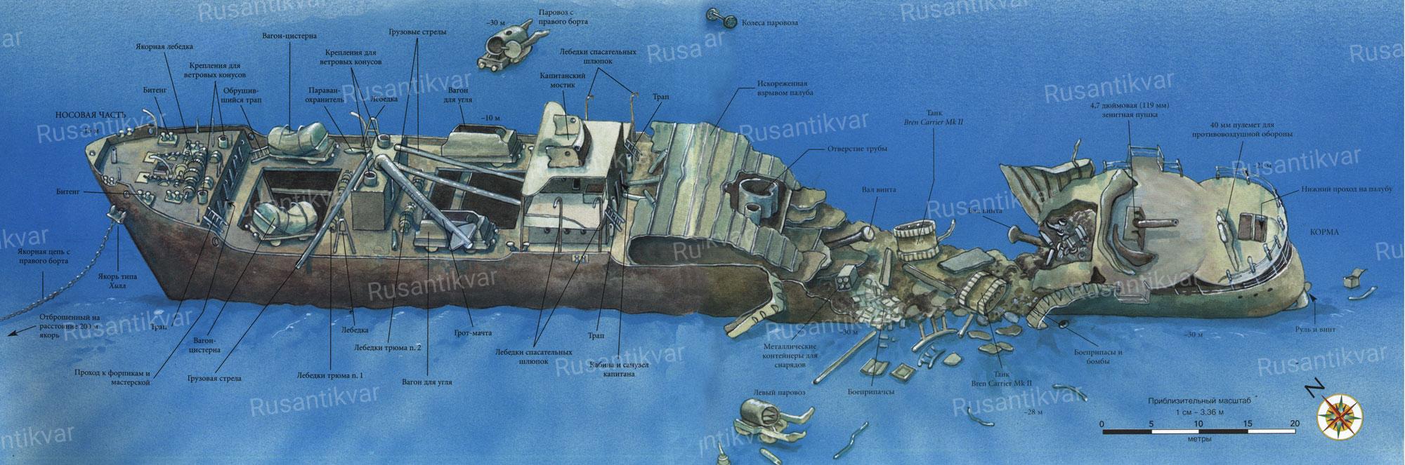 Сергей Куликов, руководитель клуба подводного плавания «Диво» рассказывает: «Опустились мы по левому борту на глубину около 20 метров. Нам очень повезло, так как частое сильное течение отсутствовало, что помогало нам внимательнее рассматривать объекты под водой. Вдали мы разглядели силуэт локомотива. Впереди по ходу движения мы увидели два перевёрнутых танка Bren Carrier MKII. За ним остались ящики со снарядами, множество обломков, 4-х дюймовое орудие Mark VIII, стоящее на корме и зенитная пушка. Заранее вооружившись фонариками, беспрепятственно осматривали все углы и закоулки трюмов затонувшего корабля. Выхваченные из темноты лучиком фонарика рыбки приходили в движение и радовали взгляд. Конечно, самым интересным был осмотр трюма, где находились грузовики с мотоциклами в кузовах. Больше всего поразило, насколько хорошо сохранилась резина. Всё было изъедено ржавчиной и изменено коррозией до неузнаваемости. Было ощущение, что на старые, пришедшие в полную негодность мотоциклы надели совершенно новые колеса. Конечно, было заметно, что не только агрессивная морская среда разрушает содержимое трюмов корабля, но и гораздо более агрессивное человеческое сообщество, которое откручивало и выносило всё, что можно было открутить и унести. Было удивительно видеть отсутствие в грузовиках двигателей и рулей, зеркал и стекол. Много в трюмах было резиновых сапог, которые настолько хорошо сохранились, что так и подмывало взять парочку себе и товарищу».