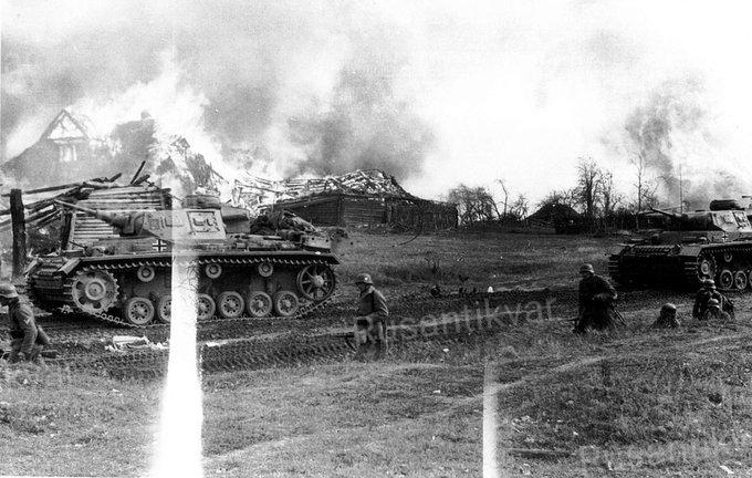 4. Немецкие средние танки Pz.Kpfw. III и пехота продвигаются через горящую деревню в районе Вязьмы, октябрь 1941 года.