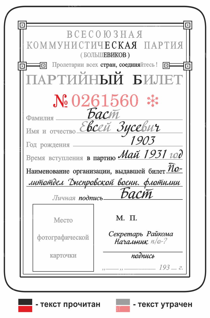 Баст Евсей Зусевич ,1903 г.р., член ВКП(б) с мая 1931 года. Партбилет выдан Политотделом Днепровской военной флотилии (не ранее 1936 года, в связи с заменой документов старого образца на новые) ...»
