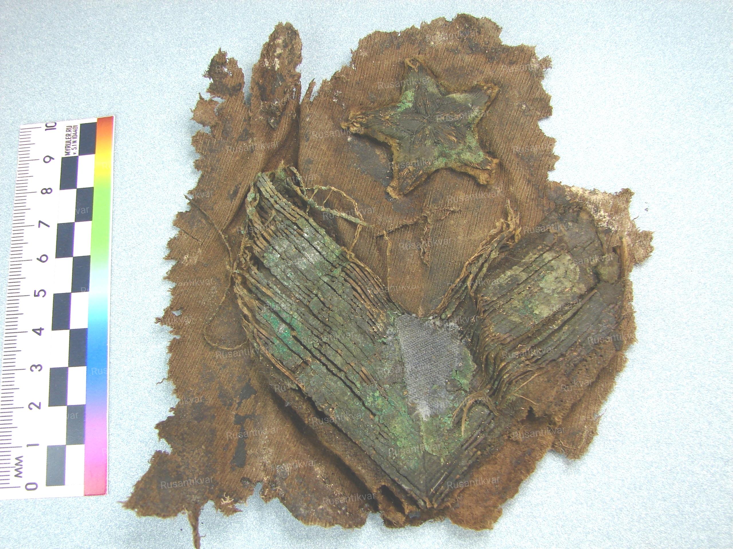 12. Нарукавные знаки различия, найденные вместе с останками, после предварительной расчистки;
