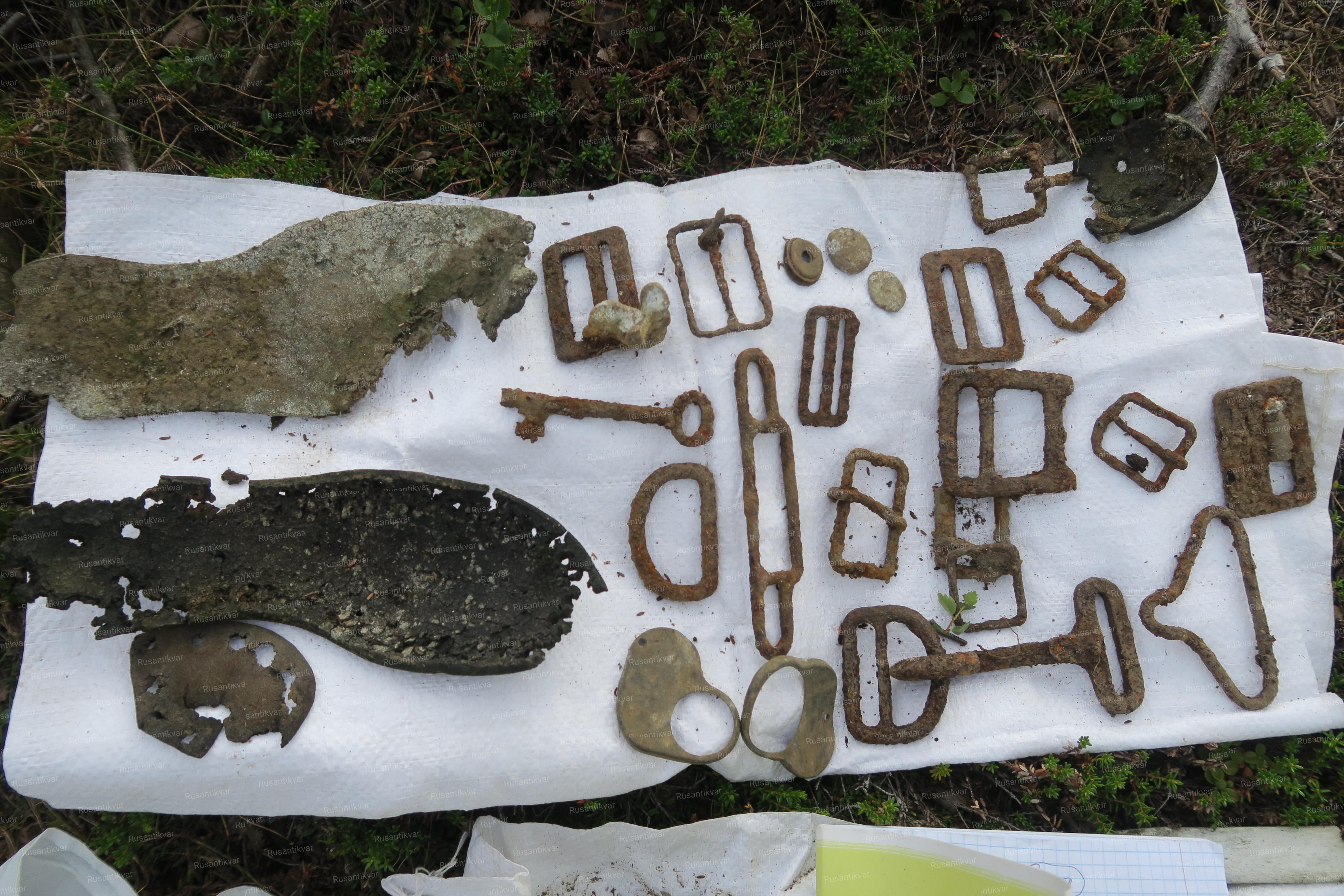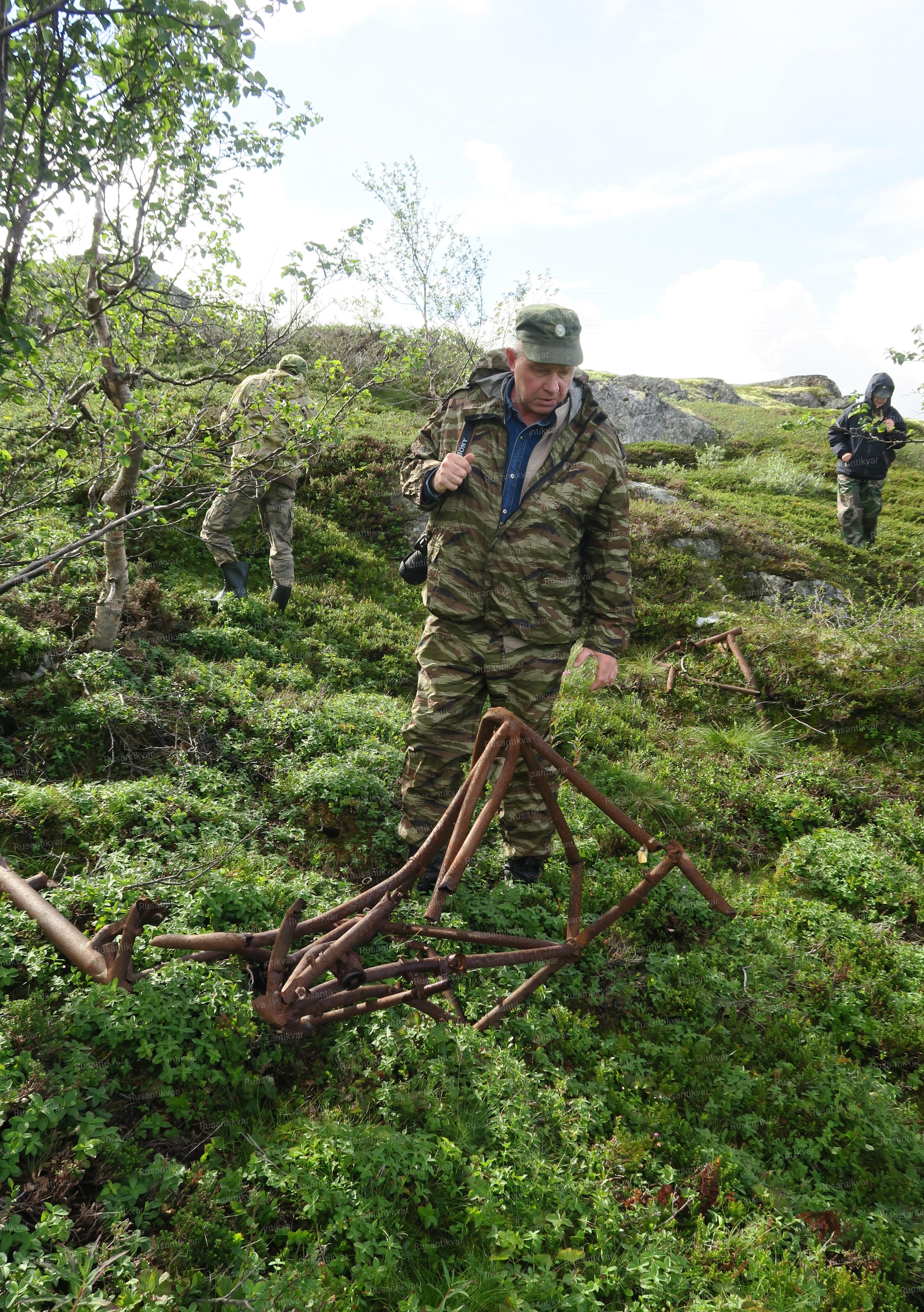 На следующий день наша объединенная команда, захватив необходимое оборудование, выдвинулась к месту падения самолета. Площадка, на которой предстояло работать, располагалась на горной гряде с выступающими острыми скальными породами, в 500 м. юго-восточнее высоты Черная. Вниз, в сторону подножья высоты, уходила неширокая лощина, поросшая карликовыми березками и ягодником вперемешку с подложкой ягеля. Сразу бросились в глаза выступающие из подо мха ржавые остовы крупных силовых элементов самолёта, сползшие, видимо, с весенними снегами вниз по лощине. На самой площадке, в точке соприкосновения самолёта с землей, весь грунт в радиусе 15-20 м. был просто нашпигован искореженным металлом, а куски изломанного дюраля виднелись среди камней на удалении более 30 м от эпицентра. В ходе поисковых работ по зачистке места падения были подняты многочисленные фрагменты дюралевой обшивки самолёта, усилители конструкции, всевозможные трубопроводы, элементы авиационного электрооборудования, части радиостанции, тросики управления. Были найдены кронштейны крепления бортового вооружения, патроны калибра 7.62 мм в разорванных лентах. Стальные детали имели сильную коррозию, детали из дюралюминия местами были сильно оплавлены и обожжены, хотя на некоторых сохранились следы заводской краски. Ближе к правому краю раскопа попался участок, где дюралюминий расплавился до образования характерных слитков, в которые были вплавлены детали из чёрного металла. Это значило, что процесс горения протекал при очень высокой температуре. В районе обнаружения частей кабины были найдены корпуса и циферблаты различных авиаприборов, бортовые часы, переключатели. Куски разбитого оргстекла остекления кабины присутствовали по всему периметру раскопа.