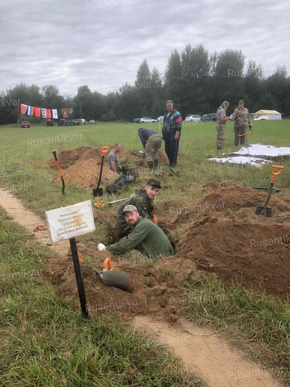 В дальнейшем работы переместились на поле, расположенное за Памятным знаком, установленным Мариной Фроловой - племянницей раненного и умершего от ран в своем первом бою при штурме Новиков командира орудия СУ-76 младшего лейтенанта Лашкова Николая Ивановича. Поле было засеяно рапсом, поэтому мы обратились к председателю Шапечинского сельисполкома Святославу Драбцову – нашему старому другу и товарищу с 2007 года – с первой поисковой экспедиции, которую мы проводили на территории Белоруссии, который оказал помощь в решении с руководителем хозяйством вопроса о скашивании части поля, где, согласно архивным данным, должна была проходить траншея. Наши предположения оказались верными, и мы нашли эту траншею, в которой сразу же были обнаружены останки боевого расчета ПТР. По всей видимости, в окоп попал крупный снаряд калибром 150-180 мм, останки обоих бойцов были разбиты крупными осколками, именных предметов среди сопутствующих предметов найдено не было. В начале поля был обнаружен блиндаж, в котором находилось большое количество зимнего обмундирования – тулупы, валенки, а также другая амуниция РККА. У стенки обнаружены остатки перины, но самое странное, что блиндаж был заминирован. В углах блиндажа обнаружены гранаты Ф-1, РГ-42, РПГ, котелок с тротиловыми шашками, и даже в перине находилась граната, все они между собой были соединены советским телефонным кабелем. Блиндаж был «переходной» (под полом были обнаружены фрагменты предметов немецкого снаряжения), эти позиции по несколько раз переходили из рук в руки и, по всей вероятности, когда наши бойцы оставляли эту позицию, заминировали блиндаж, чтобы находившееся там имущество не досталось врагу. В отдельных стрелковых ячейках были найдены останки ещё семерых красноармейцев и одного военнослужащего вермахта. В следующем году это поле не будет засеваться, поэтому мы сможем отработать оставшиеся участки.