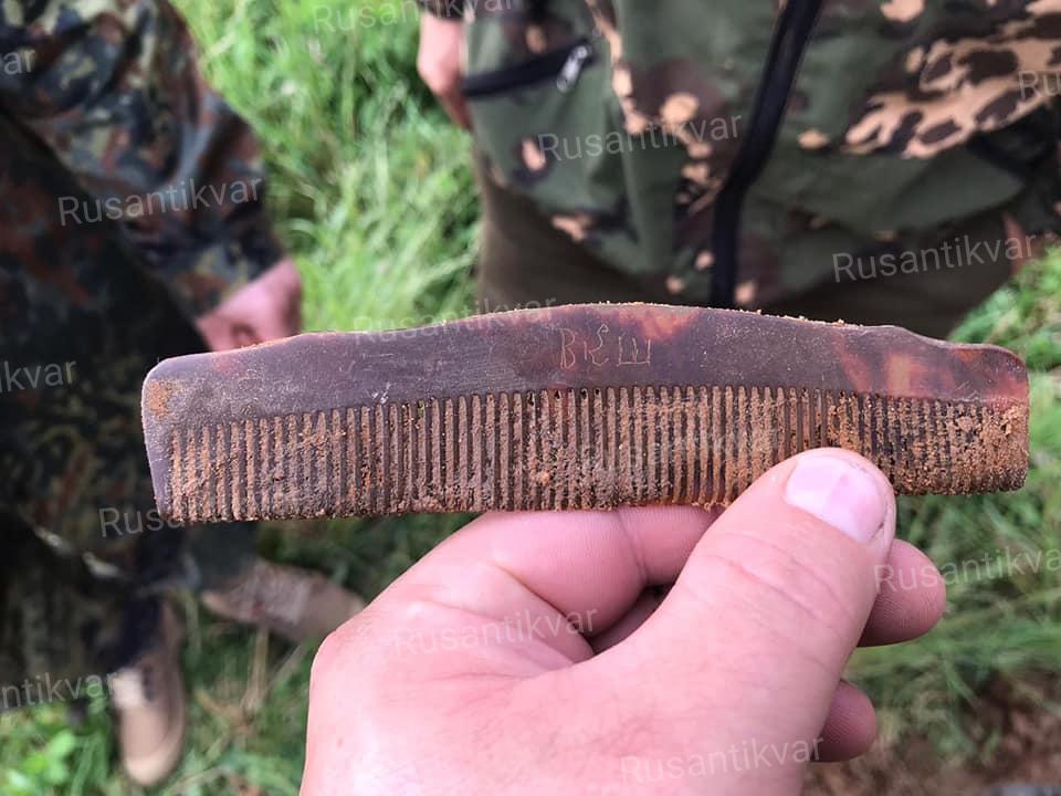 Во второй день экспедиции, благодаря совмещенной с картой трофейной аэрофотосъёмке, удалось зацепиться за траншею и две большие воронки в непосредственной близости от полевого лагеря. В воронках обнаружены останки разбитой военной техники, боеприпасы и различное снаряжение РККА. В траншее обнаружены незахороненные останки четырёх советских воинов и сопутствующие предметы: пробитый пулей знак «Гвардия», револьвер Нагана, истлевшие погоны лейтенанта, пустой солдатский медальон, очки в футляре, личные вещи бойцов, гранаты, патроны, противопехотные деревянные мины. К сожалению, ни одного идентифицирующего бойцов предмета найдено не было. В последующие 4 дня работы на этом поле были продолжены, в общей сложности здесь были обнаружены и эксгумированы останки 18 солдат и офицеров Красной армии. Среди сопутствующих предметов найдены крышка от котелка с подписью «Супрун», расческа с инициалами «ВКШ», перочинный нож с надписью «Гари…», три кошелька с личными предметами: зажигалки, монеты, пуговицы, погоны, которые переданы на исследование. В кустарнике на окраине поля была обнаружена медаль «За отвагу», останков рядом не было, возможно, награда была утеряна, тем не менее, по медали запрос отправлен в ЦАМО РФ для выяснения имени награждённого. Наша организация совместно с белорусской стороной проводит бессрочную акцию «Награда – внукам», в рамках которой мы передаём найденные награды родственникам солдат и офицеров РККА. Параллельно с полевыми работами проводилось исследование места переправы на реке Лучёса. С глубины 2 метра, с помощью наших белорусских коллег, были подняты останки двух красноармейцев.