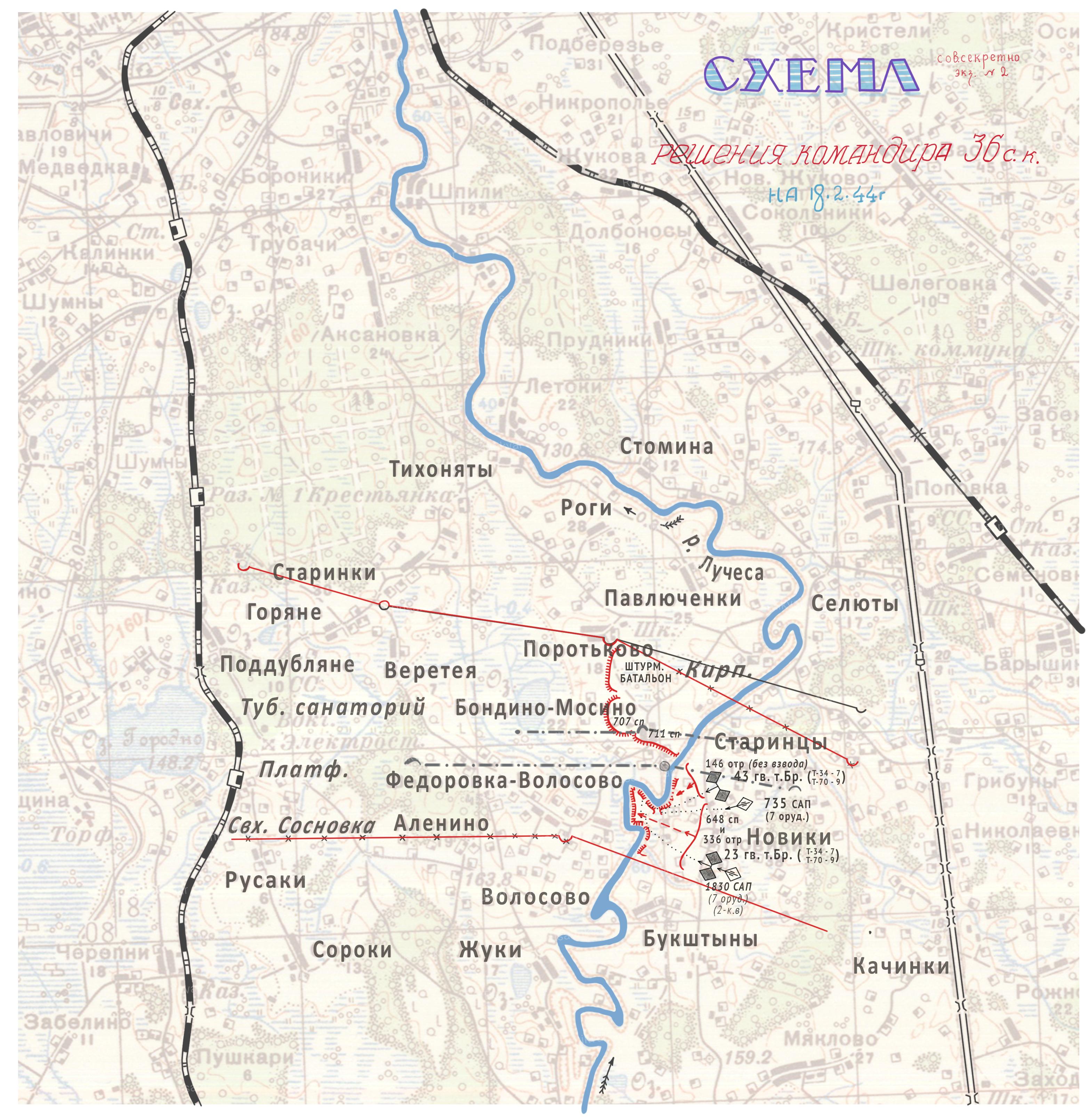 Наступление от берегов Лучёсы, начавшееся 3 февраля 1944 года, со следующим приказом: форсировать реку Лучёса, перерезать железную дорогу Витебск – Орша, выйти к реке Западная Двина и южной окраине Витебска (ЖБД 735 САП. ЦАМО: Ф. 4354. Оп. 126273. Д. 6.) не достигло своей цели. Серии наступлений войск Западного фронта в течение февраля – марта следовали одна за другой: 3-13 февраля 1944 г., 16-17 февраля 1944 г., 20 – 22 февраля 1944 г., 28 февраля 1944 г., 3 – 8 марта 1944 г., с 21 – 29 марта 1944 г. Но продвижение на этом участке оказалось в феврале 3 км, в марте 1 – 1,5 км (ЖБД 33 А за февраль 1944 г. ЦАМО: Ф. 208. Оп. 2511. Д. 3131. ЖБД 33 А за март 1944 г. ЦАМО: Ф. 46. Оп. 2394. Д. 599а. Таким непробиваемым был этот участок заранее выстроенной, глубоко эшелонированной обороны немецких войск. Ими были использованы все преимущества высокой местности западного берега (Бондино-Мосино, Фёдоровка-Волосово), достигнуто господствующее положение над значительным участком реки Лучёса. Огнём своей артиллерии противник способствовал удержанию крупного плацдарма на восточном берегу, не давал форсировать реку.