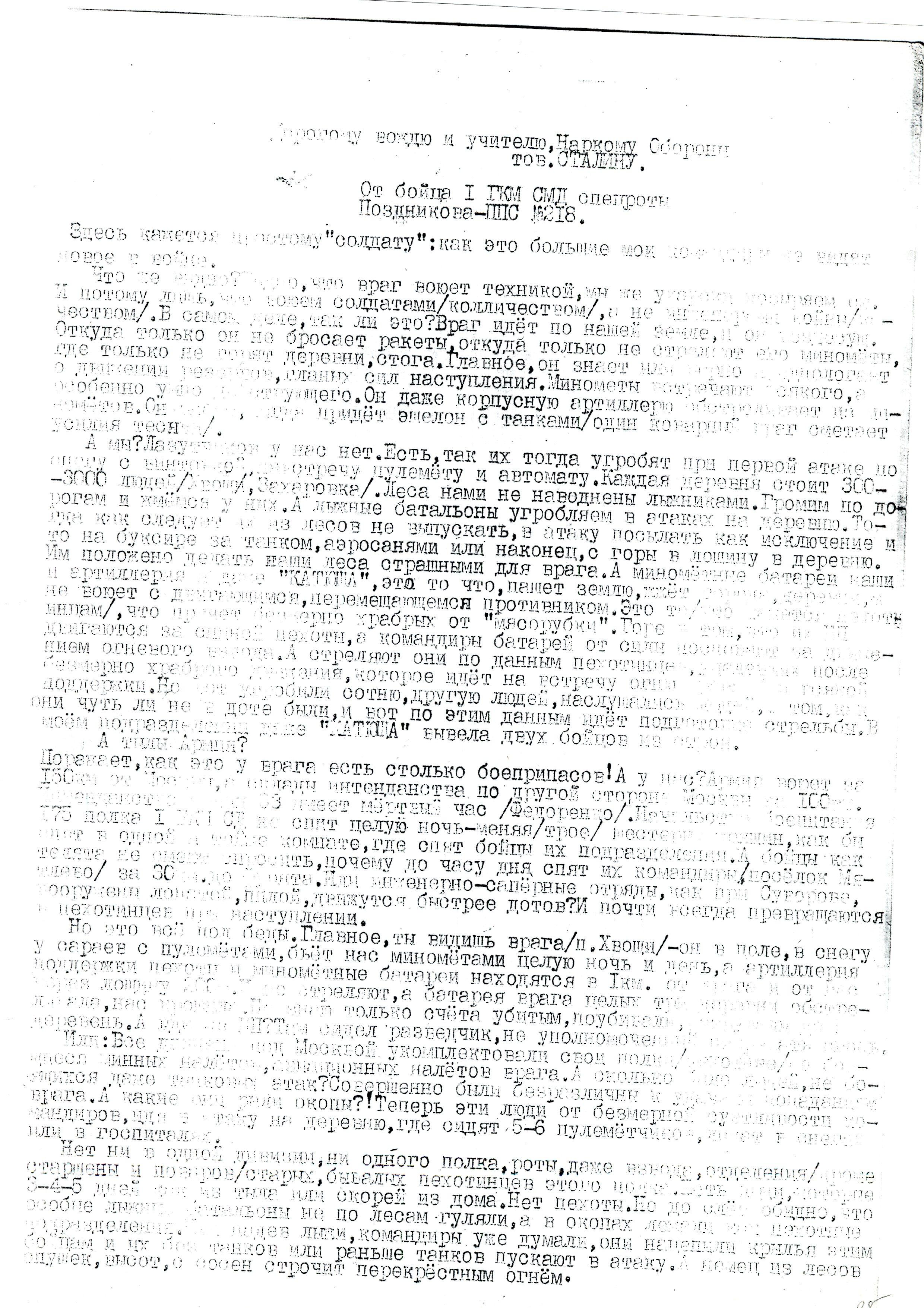 Как-то, в середине 90-х годов, работая в ЦАМО, нашим друзьям из Тульского областного поискового центра «Искатель», удалось обнаружить интересное письмо на имя Иосифа Сталина. Подшито оно было среди боевых донесений одной из дивизий 50-й или 61-й армии. Номер дела ребята, к сожалению, тогда не зафиксировали. Собственно говоря, работа группы в архиве, в основном была направлена на поиск информации о боевых действиях на территории Тульской области. И больше всего их интересовали на тот момент сведения о потерях советских войск, описание сражений, боевые сводки и донесения. Попадались среди подшитых в папки листов и достаточно любопытные документы, не имевшие практического значения для поиска, но интересные с исторической точки зрения, которые ребята, прочитав и обсудив, закрывали и двигались дальше. Одним из таких, особо запомнившихся документов, и было упомянутое выше письмо рядового бойца, адресованное Сталину и фактически критикующее положение дел в действующей армии.