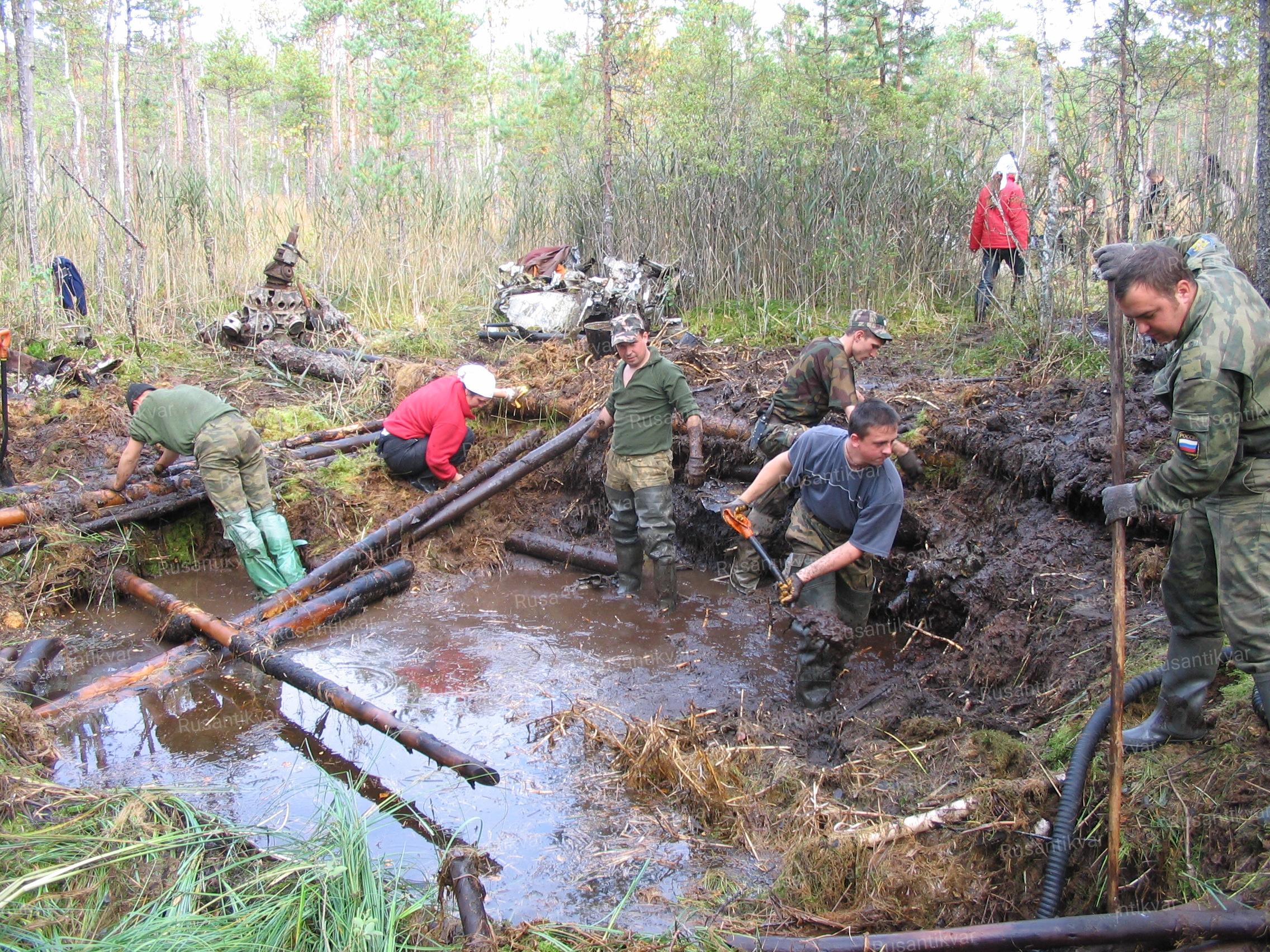 Большую воронку на болоте «Малый Мох» нам еще в 2003 году показали местные жители, собиравшие в этих местах ягоды. Тогда, обследовав обломки самолета, мы предположили, что он разбился летом 1941 года. Внимательно осмотрев то, что осталось от моторов, нам удалось установить их заводские номера: М-87а №№ 87335, 87382. Опросив местное население, и внимательно изучив накопившиеся материалы по переписке конца 70-х начала 80-х годов группы «Поиск» совета ветеранов ВВС Ленинградского военного округа, нам удалось получить кое-какие дополнительные сведения. Оказывается, в 50-е годы местные жители обнаружили у воронки останки одного из погибших членов экипажа. В документах, говорилось: «…в районе д. Редькино Волосовского района в 112 км от Гатчины в болоте найден бомбардировщик Дб-3ф (Ил-4), упавший 15 сентября 1941 года. Из воронки извлечены останки летчика. В петлицах две шпалы. Самолет № 180246, мотор марки 82-34. Мотор вынут лебедкой…».