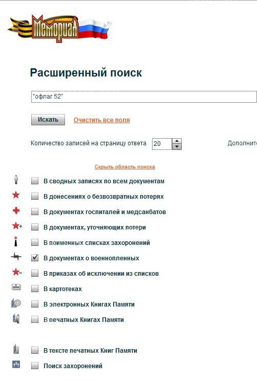 Допустим, вы решили пойти от конкретного лагеря и начали, к примеру, с Oflag 52. Тогда забиваете в поисковую строку ОБД «офлаг 52» (русскими буквами, в ОБД немецкие названия лагерей пишутся по-русски – дулаг, шталаг, офлаг; кавычки нужны для того, чтоб ОБД нашел вам именно такое словосочетание, в противном случае вы получите огромный список из воинов, в данных на которых содержится и слово офлаг и число 52), снимаете галочки во всех окошках кроме документов о военнопленных (Илл. 1) и жмете кнопку «Искать». ИЛЛЮСТРАЦИИ 1 и 2