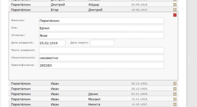 Действуя аналогичным образом, идем по списку дальше, отбирая, если необходимо, своих земляков по данным в правой колонке. Если она пуста, не пожалейте нескольких секунд, кликните на такого воина – нередко в самом документе место рождения указано, просто не вынесено в критерии поиска. И так, лагерь за лагерем…