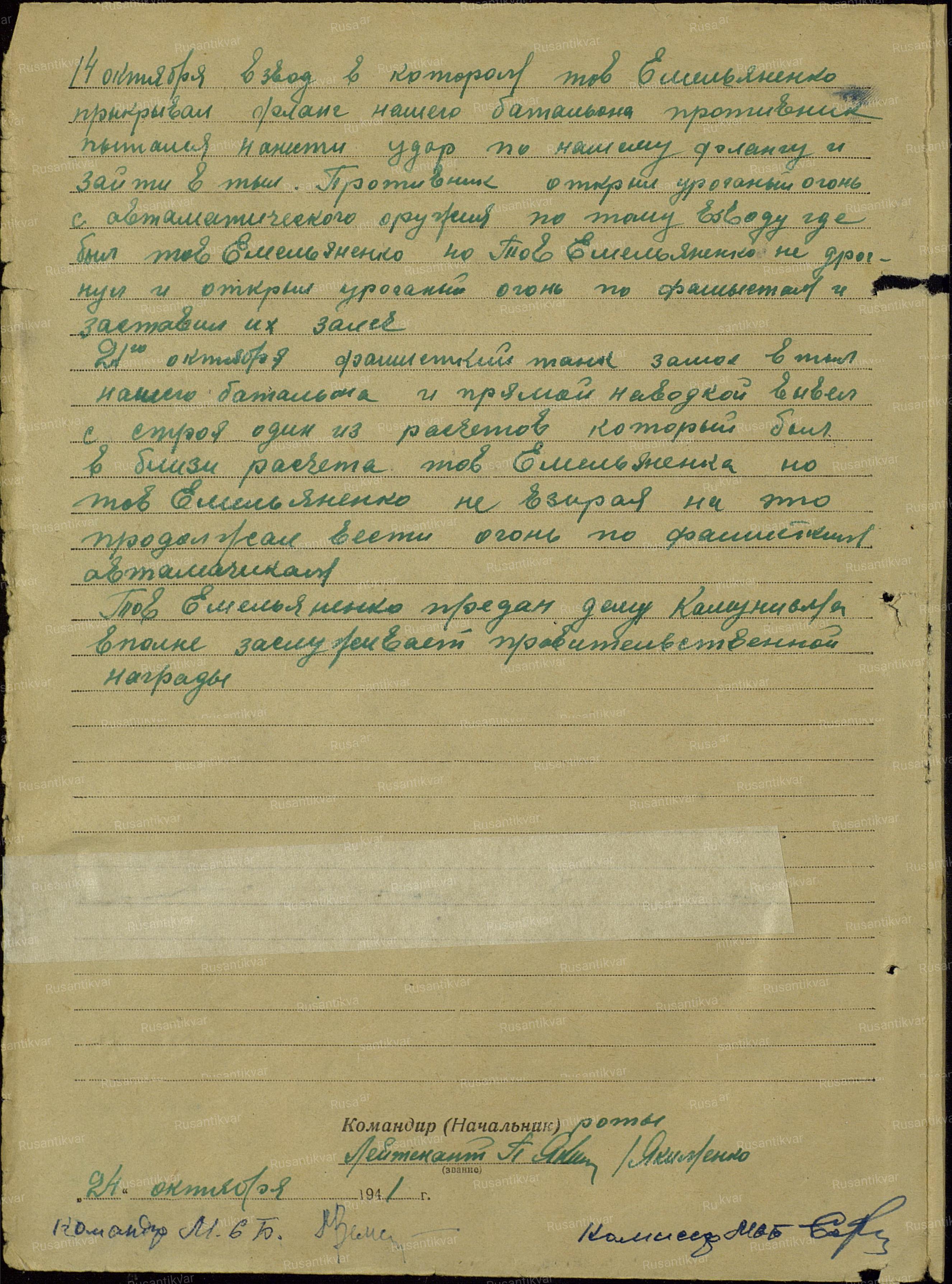 Наградной лист Ф.И. Емельяненкова. Упоминаемый в нем капитан Чапаев — сын комдива Гражданской войны В.И. Чапаева.