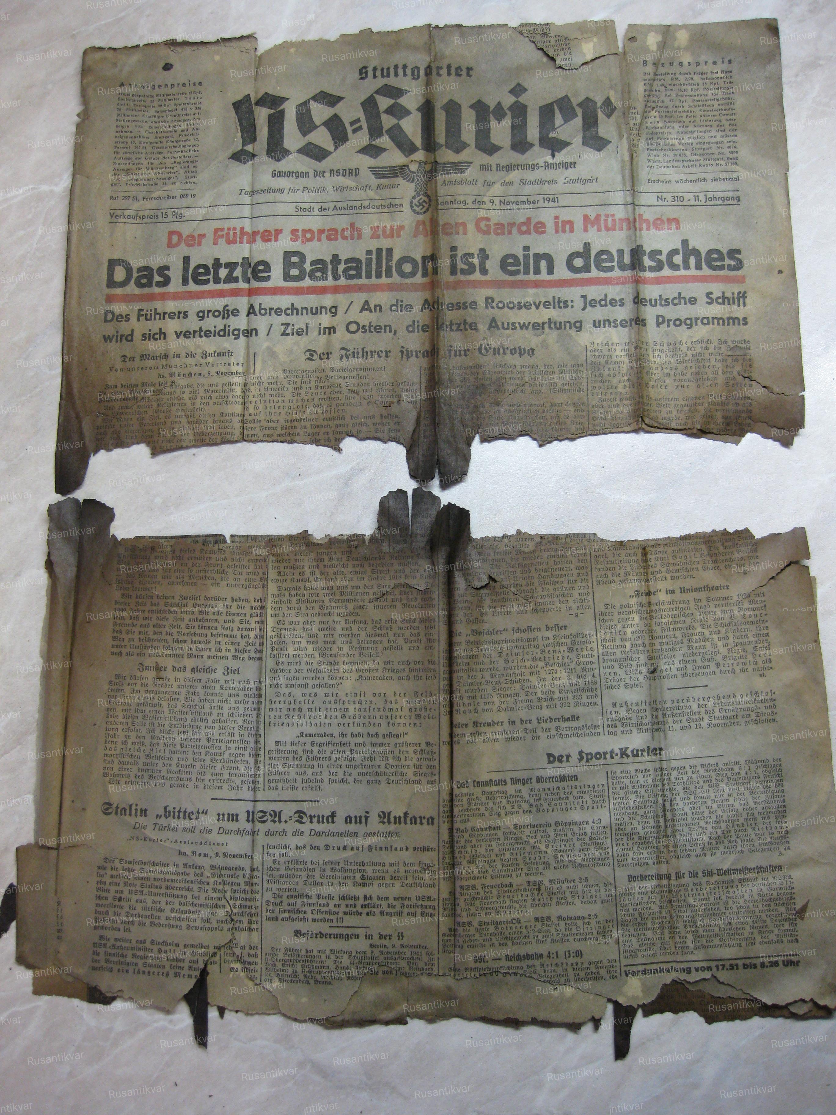 Что можно сказать сразу – немецкая окопная пресса выглядела явно разнообразнее нашей. Кипа из блиндажа была представлена четырьмя разными изданиями: «Троссингская общая народная газета», «Кёнигсбергская общая газета», немецкая фронтовая газета «Ударная группа» и Штутгартский национал-социалистический курьер. Образцы многих газет повторялись по несколько раз, и, помимо всего прочего в кипе попадались отдельные обрывки газет, исписанные цифрами тетрадные листы и потемневшие от перегрева листовки.