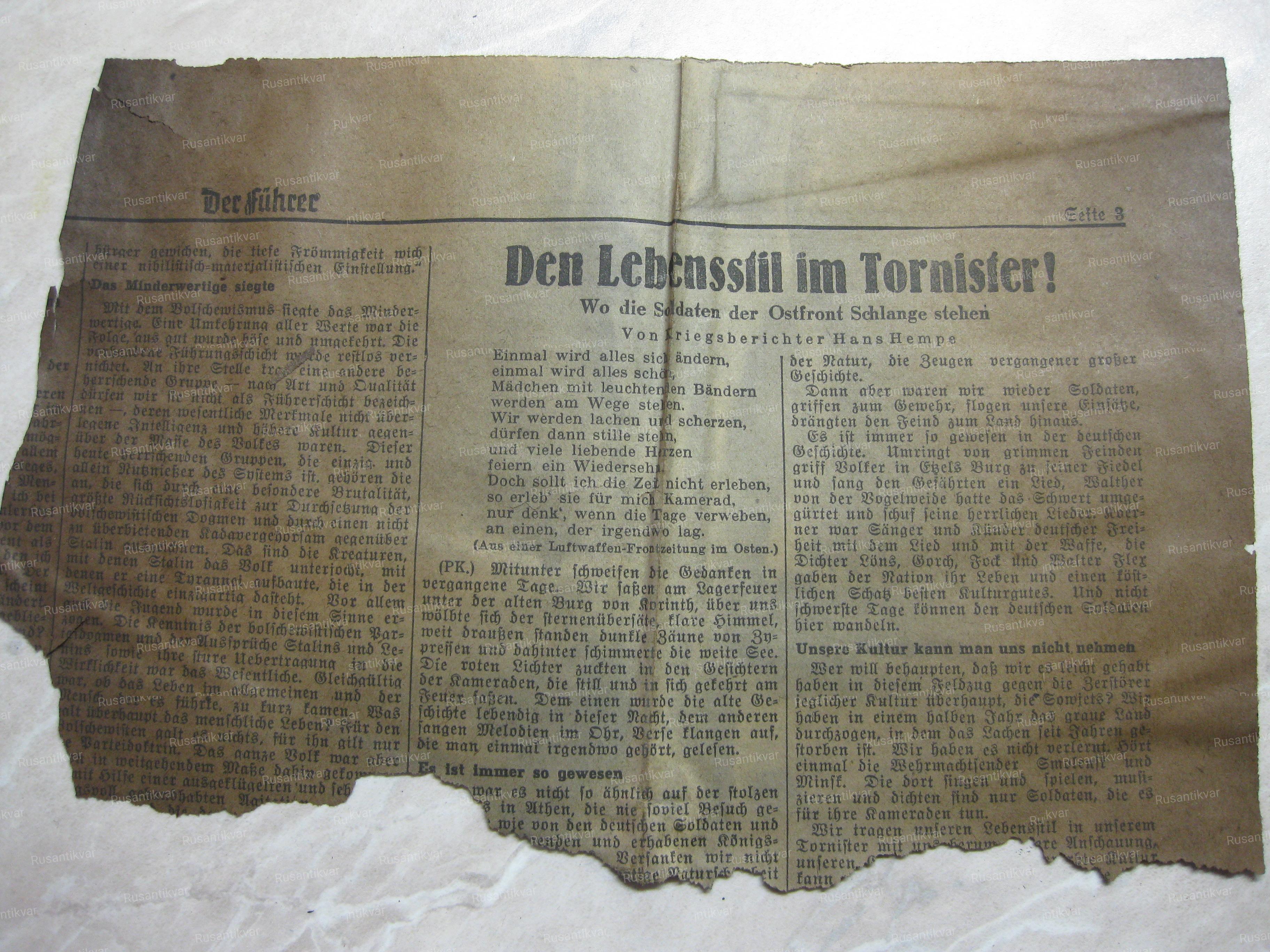 Однако терпение моего друга было награждено обгоревшей и туго набитой сумкой, похожей на суму почтальона. Перебрав обугленную пачку немецких газет, мы нашли уцелевшие экземпляры, забросить которые рука пытливого исследователя не поднялась. Аккуратно упаковав это «богатство» в пакет, я продолжил свои исследования дома, вспоминая старинную находку гильзы с газетой «Уничтожим врага». И что же читал этот враг?