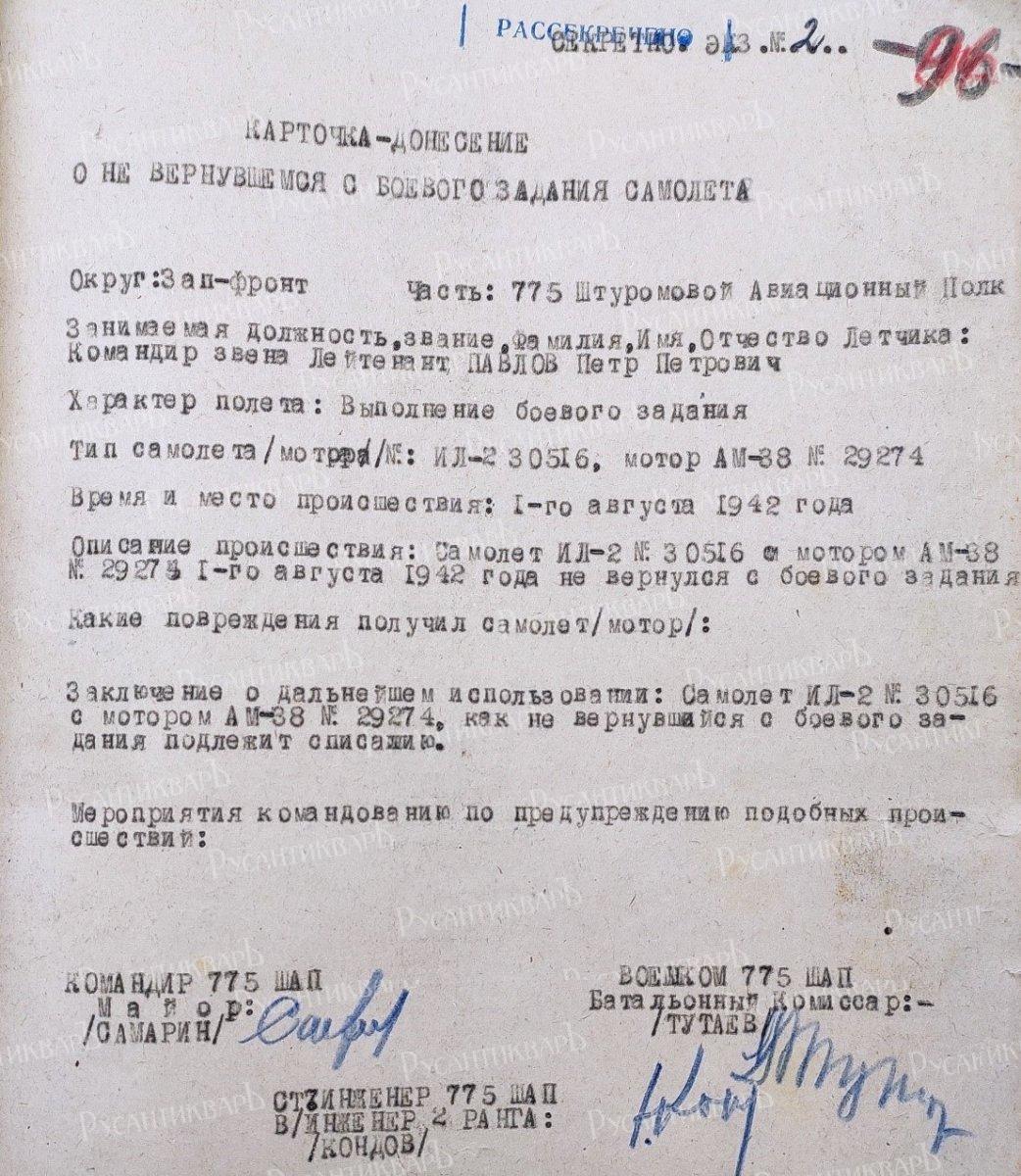 Спустя полгода, в ЦАМО РФ удалось найти карточку-донесение 775 шап о не вернувшемся с боевого задания самолёте, неопровержимо свидетельствующую о том, что 1 августа 1942 г. обнаруженным самолётом управлял лейтенант Павлов П.П. . (ФОТО 16).