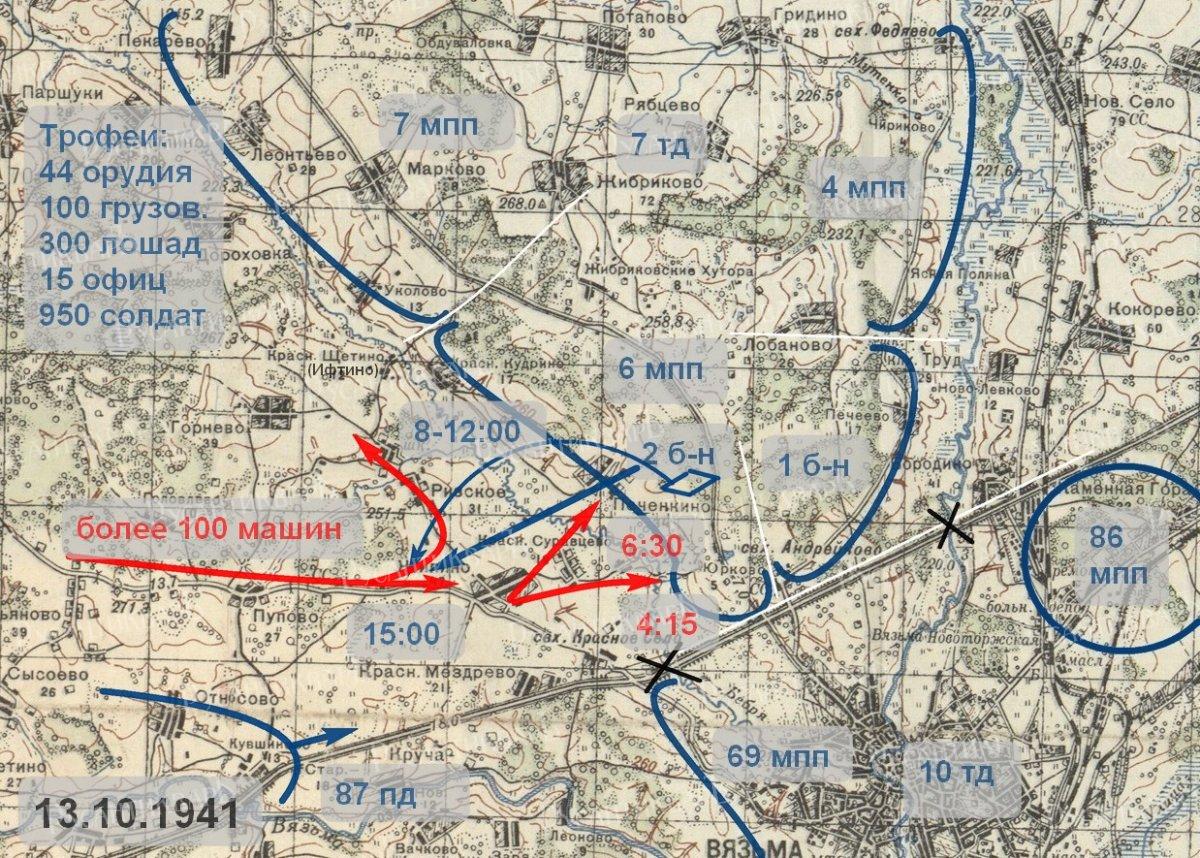 В течение 11 октября положение частей оставалось без изменения, а на утро 12 октября части 4-й армии освободили автомагистраль для продвижения к Вязьме 87-й пд, которая установила связь с 7-й тд на автомагистрали севернее Вязьмы. Рис. 13.