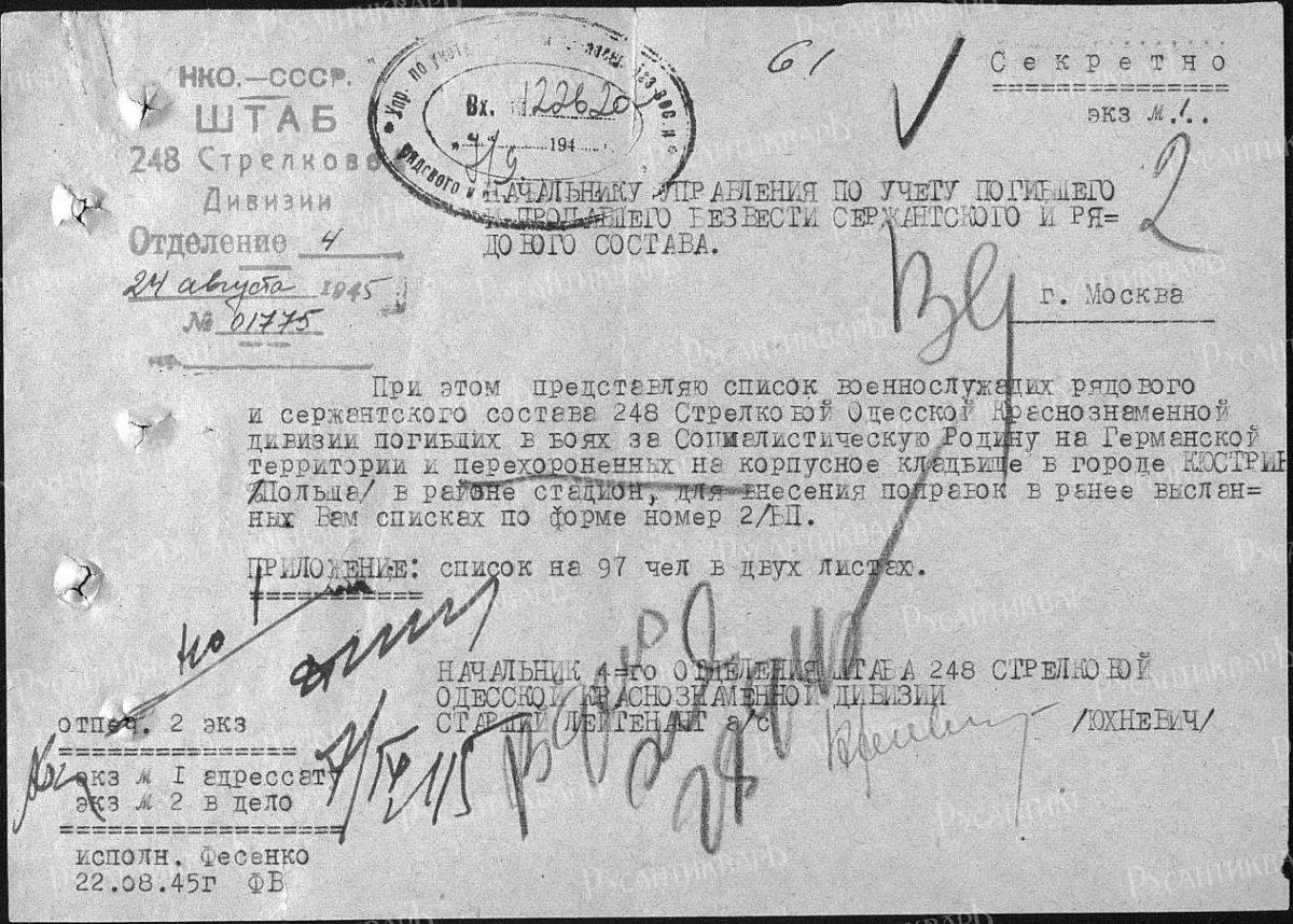 …Войска 8-й гвардейской армии 12 марта 1945 года во взаимодействии с войсками 5-й ударной армии и силами Днепровской военной флотилии овладели городом, а 30 марта — крепостью Кюстрин (Костшин)