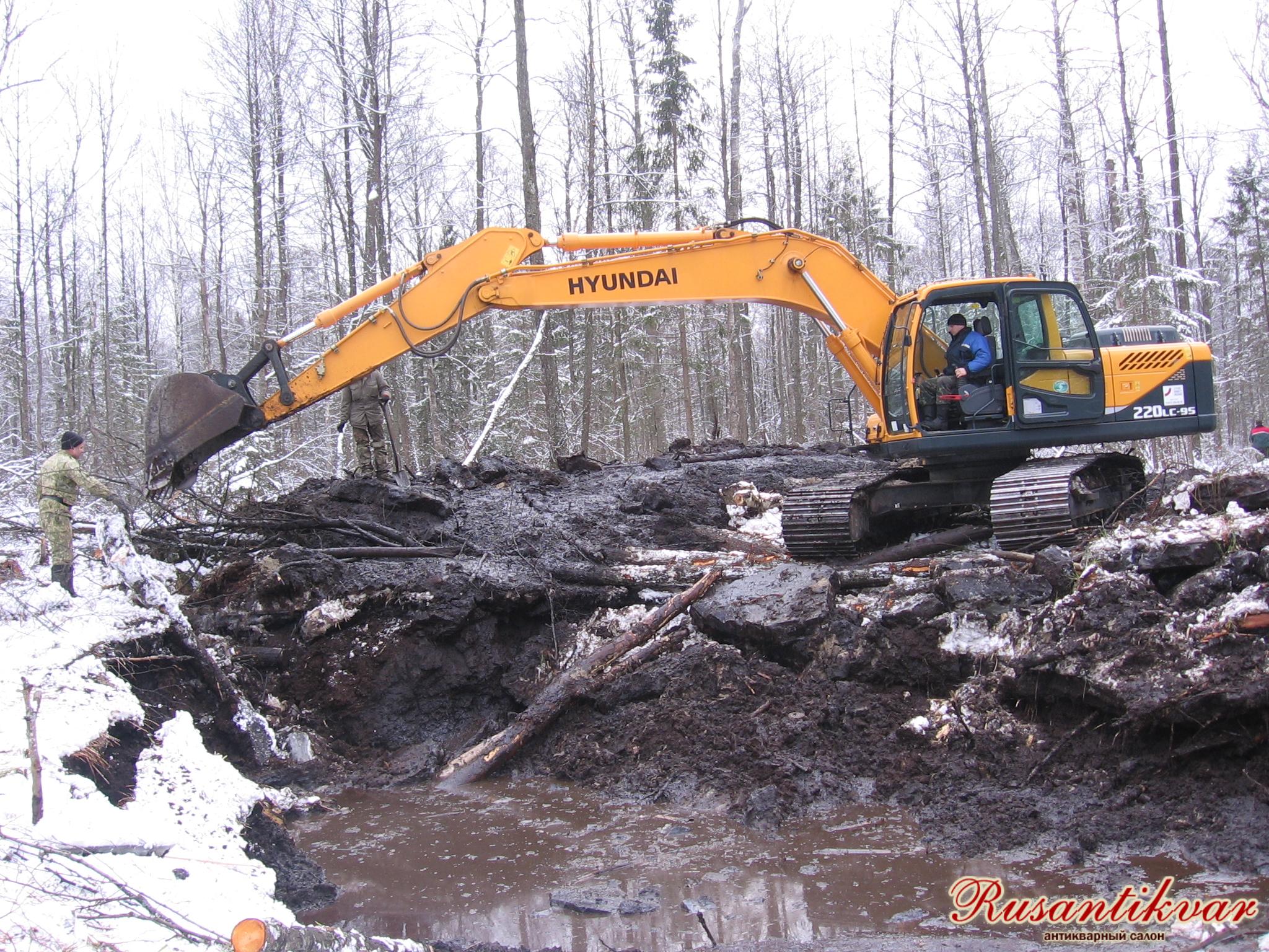 29 января 2015 года стоял легкий морозец. Земля по берегам озера промерзла на 30-40 см, и уже можно было смело использовать болотную технику. С утра здесь начал хозяйничать мощный экскаватор «Хёндай», ковш которого за один подъем брал целый кубометр земли. Проложив себе гать из бревен, он прочно обосновался на берегу болотца, и работа закипела. За световой день экскаваторщик Дима Наумчик вычерпал практически всю болотную грязь с остатками самолёта, останками лётчиков и аккуратно «разложил» сотни тонн клейкого чернозема по берегам лесного озера. К такой производительной работе экскаватора поисковики были явно не готовы. Аккуратно перелопатить тонны промерзшей земли за такое время не успела бы и сотня человек, а что уж говорить о десяти поисковиках «Виккру», которые в тот день приехали из Могилёва. Как руководитель поисковой части экспедиции я должен сказать им огромное спасибо и, в первую очередь, Сергею Тагаеву, Владу Степанцову, Александру Коростелёву, Андрею Швайкову, Егору Щанову, Виталию Мигалю и всем другим, принимавшим участие в раскопках. Именно благодаря их упорной и самоотверженной двухдневной работе в роли военных археологов, в промерзшей торфяной жиже, мы обнаружили номерные детали самолёта и костные останки двух погибших лётчиков.
