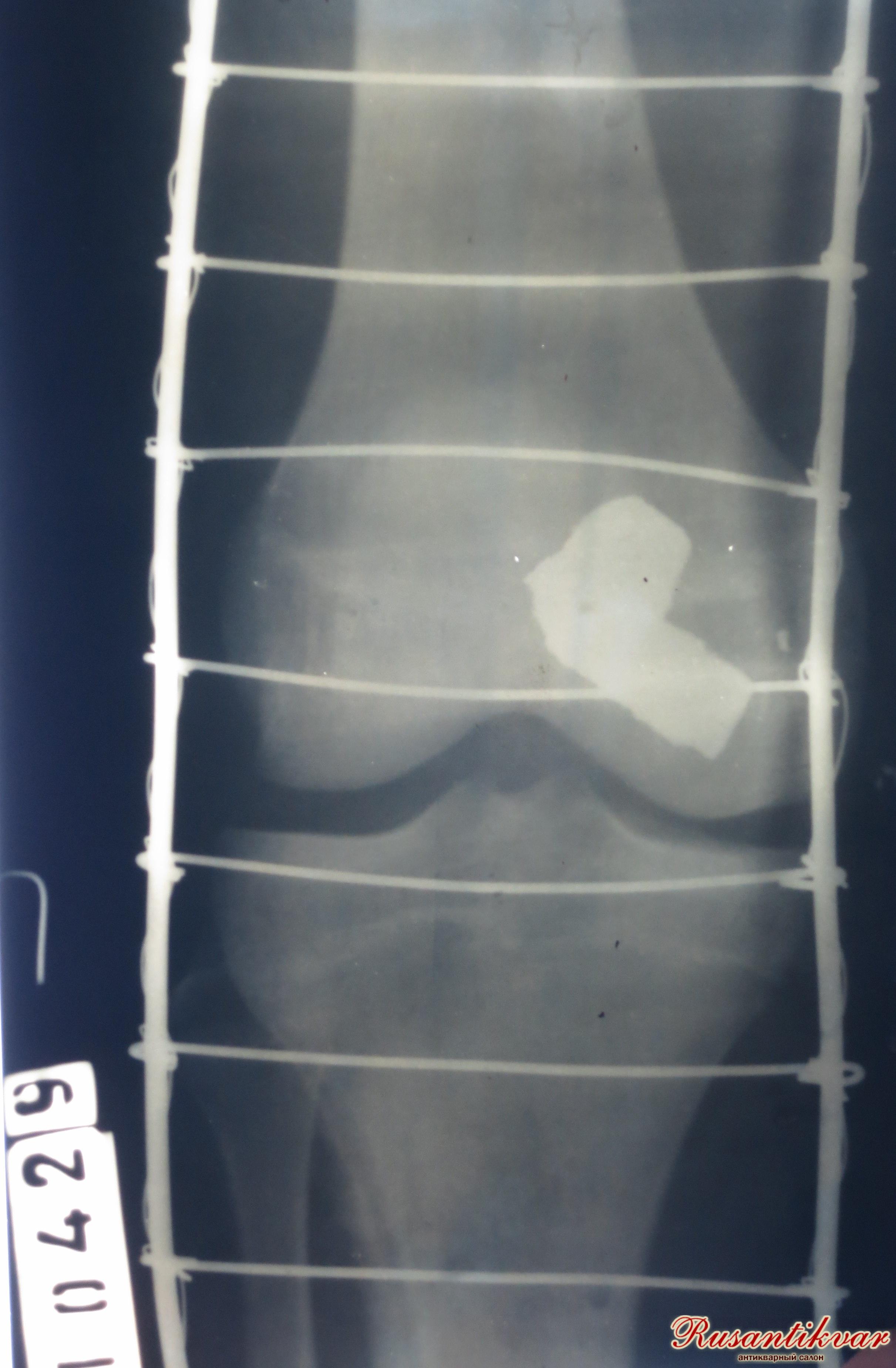 Предметный ряд рассматриваемой коллекции дополняет ещё один экспонат – рентгеновский снимок раненной шинированной ноги военнослужащего. На снимке чётко просматривается застрявший в бедренной кости осколок.