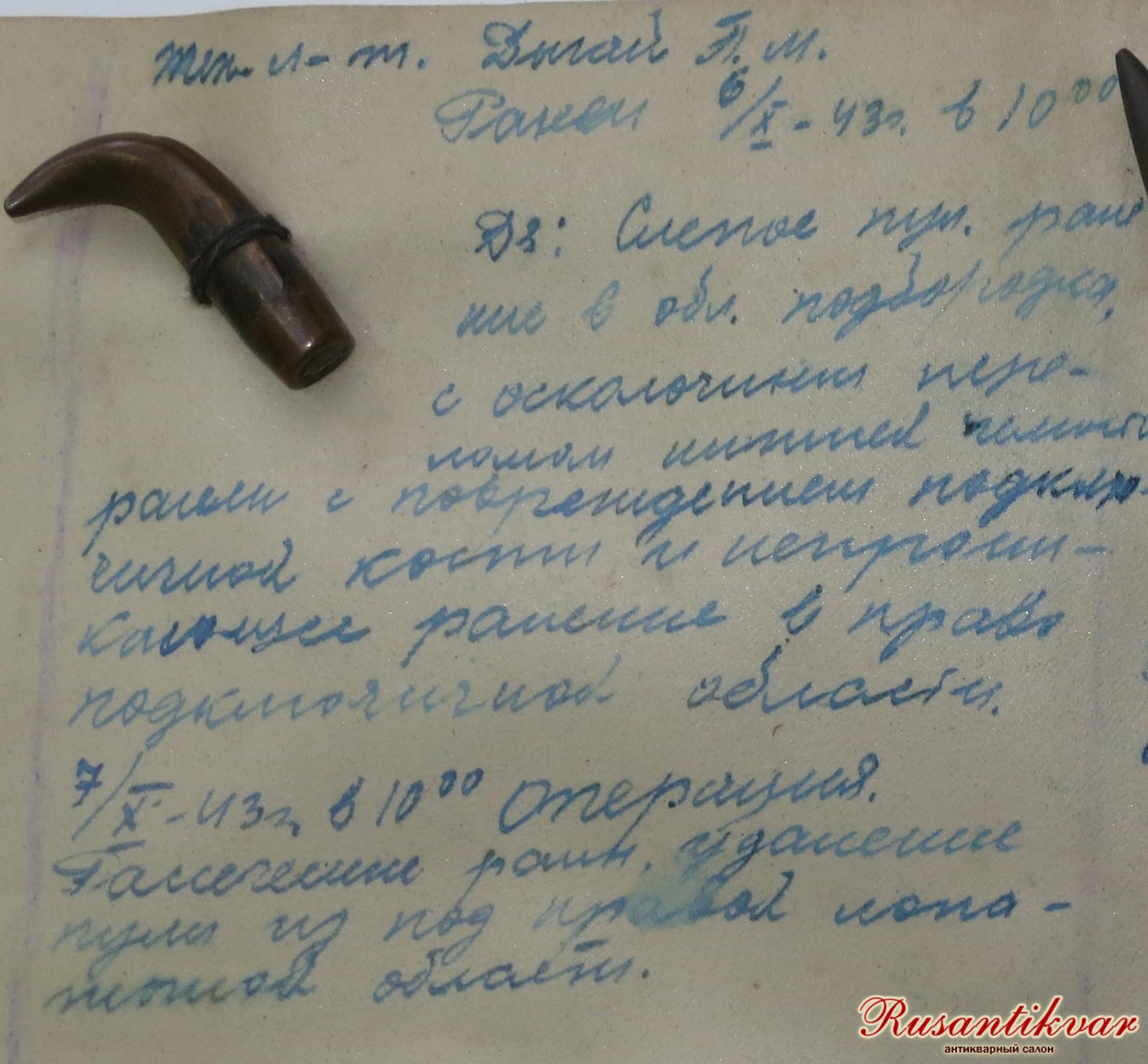 6.8.43 г. в 10.00 операция: рассечение раны и удаление осколков картечи, разбившейся на две половинки при ударе о кость.