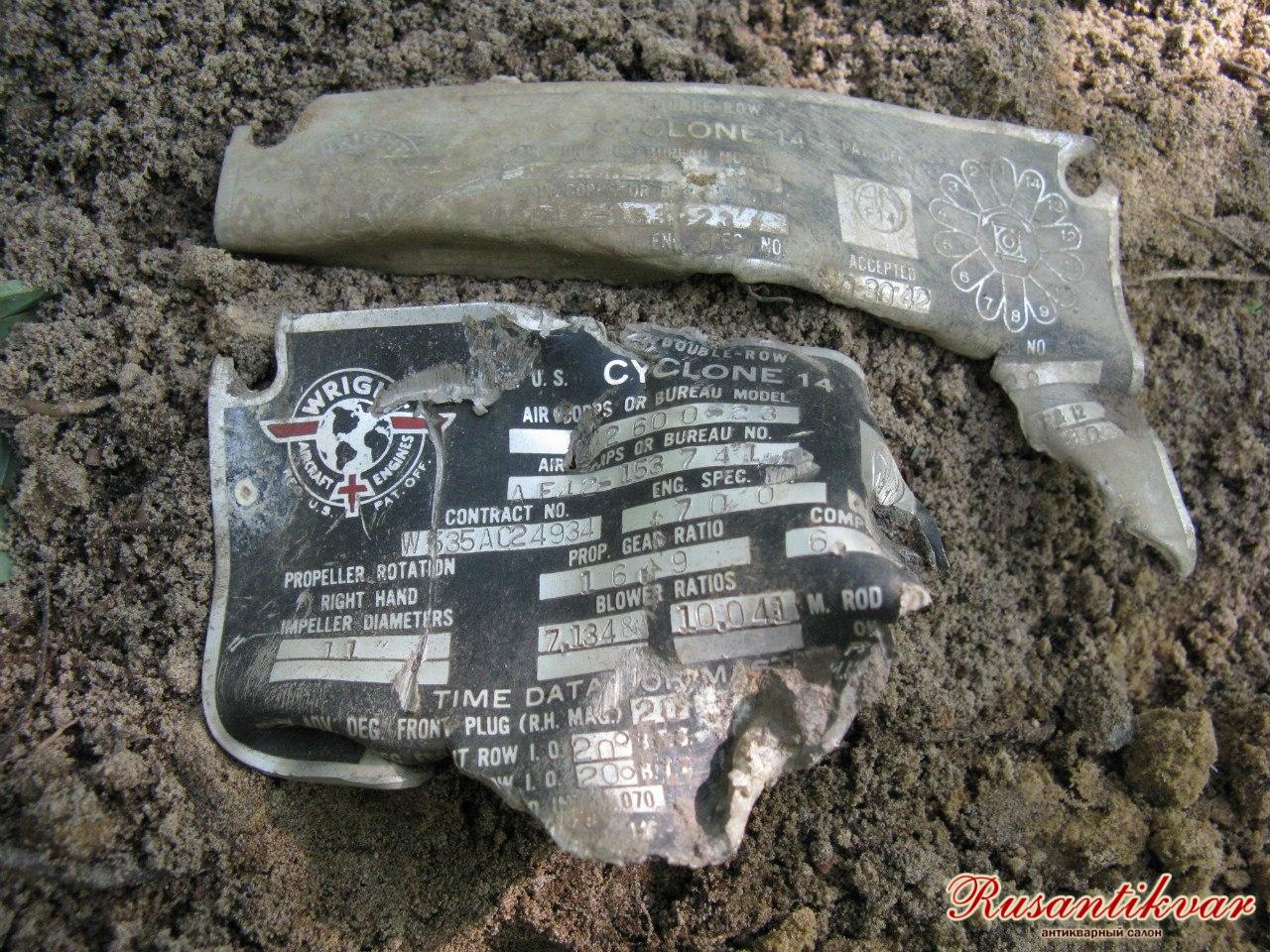 Первую значимую находку сделала Лена, впервые приехавшая со своим мужем на подобное мероприятие, как говорится - новичкам везет. Не веря глазам, мы смотрели на рваную и гнутую металлическую пластинку в ее руке со следами черной краски – заводскую бирку авиационного мотора Райт-Циклон американского производства. Сквозь налипшую грязь виднелась надпись «AIR CORPS OR BUREAU NO.» и выбитые символы в светлом поле ниже этой надписи - AF42 - 153741. Быстро нахожу копию аварийного акта, найденного в ЦАМО в начале этого года. Так и есть, номер одного из моторов в акте полностью совпадает с маркировкой! Но как она сохранилась после такой катастрофы!? Все найденные обломки мотора умещаются на ладони, большая часть из них сильно оплавлена, а сорванная с корпуса табличка хоть и пострадала, но сохранила всю информацию необходимую для подтверждения информацию.