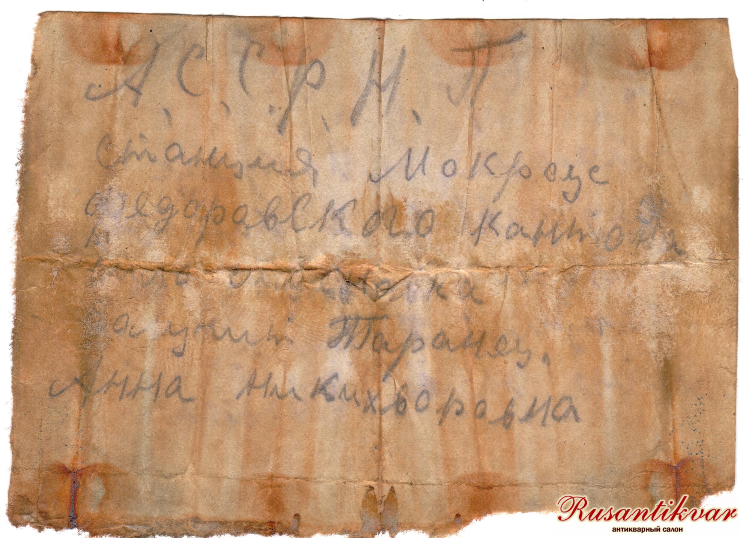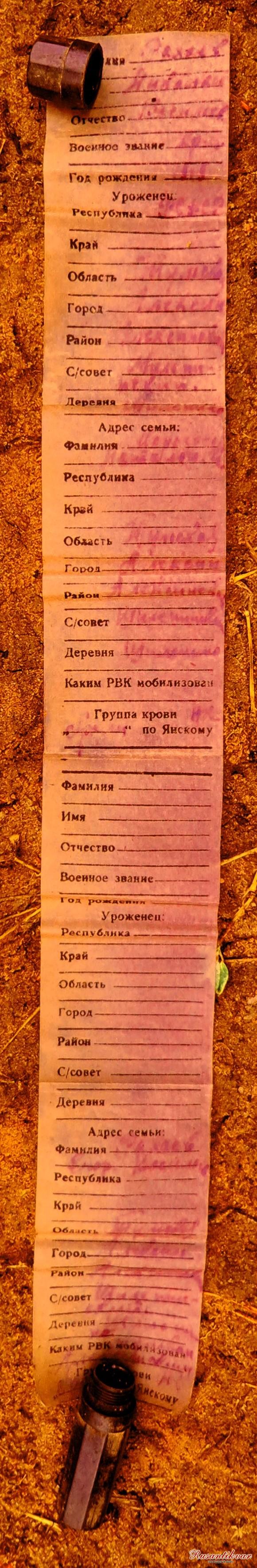 Второй медальон, как нам показалось при первичном осмотре капсулы, был уничтожен влагой и временем. Но надежда оставалась, ведь то, что нельзя сделать в лесу под дождем, можно попробовать восстановить в условиях лаборатории. Здесь к месту оказалась помощь нашего коллеги из Минска, руководителя поискового клуба «Батьковщина» Александра Дударёнка. Уже через несколько дней он позвонил и сообщил, что медальон прочитан. Однако бумажный вкладыш оказался не стандартным, а самодельным. На нём был указан лишь адрес неизвестной нам женщины, но, как оказалось позднее, самого дорогого человека для погибшего солдата – его матери. На вложенном в эбонитовый медальон обрывке бумаги хорошо читалось: «АССР НП (Немцев Поволжья), станция Мокроус Фёдоровского кантона, сило Семеновка получить Таранец Анна Никихворовна» (так в тексте – авт.). Ни имени солдата, ни года его рождения, ни звания…