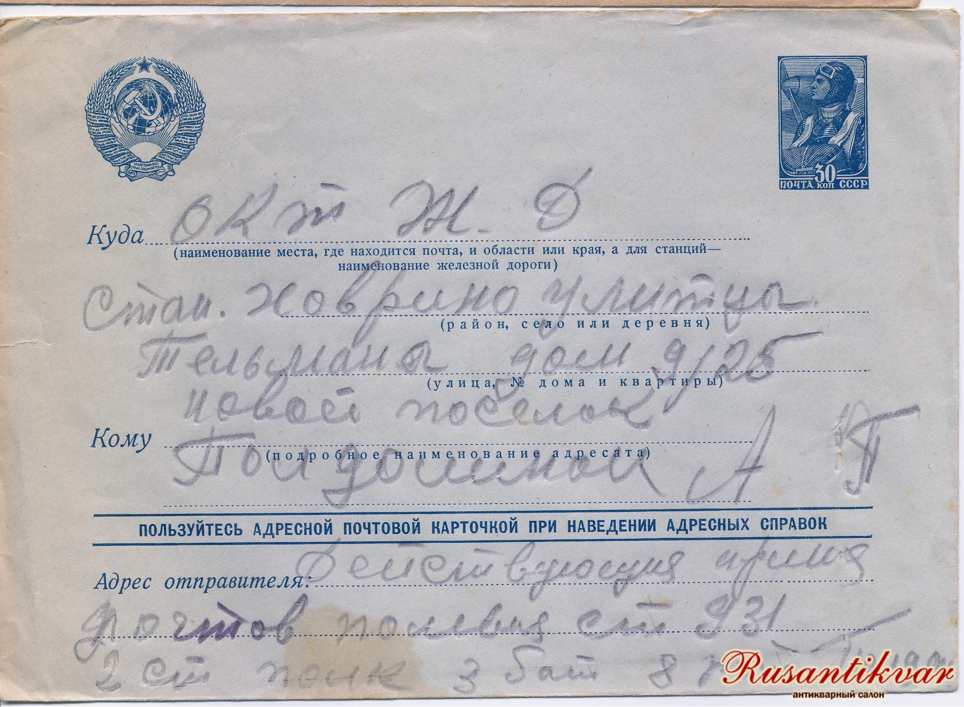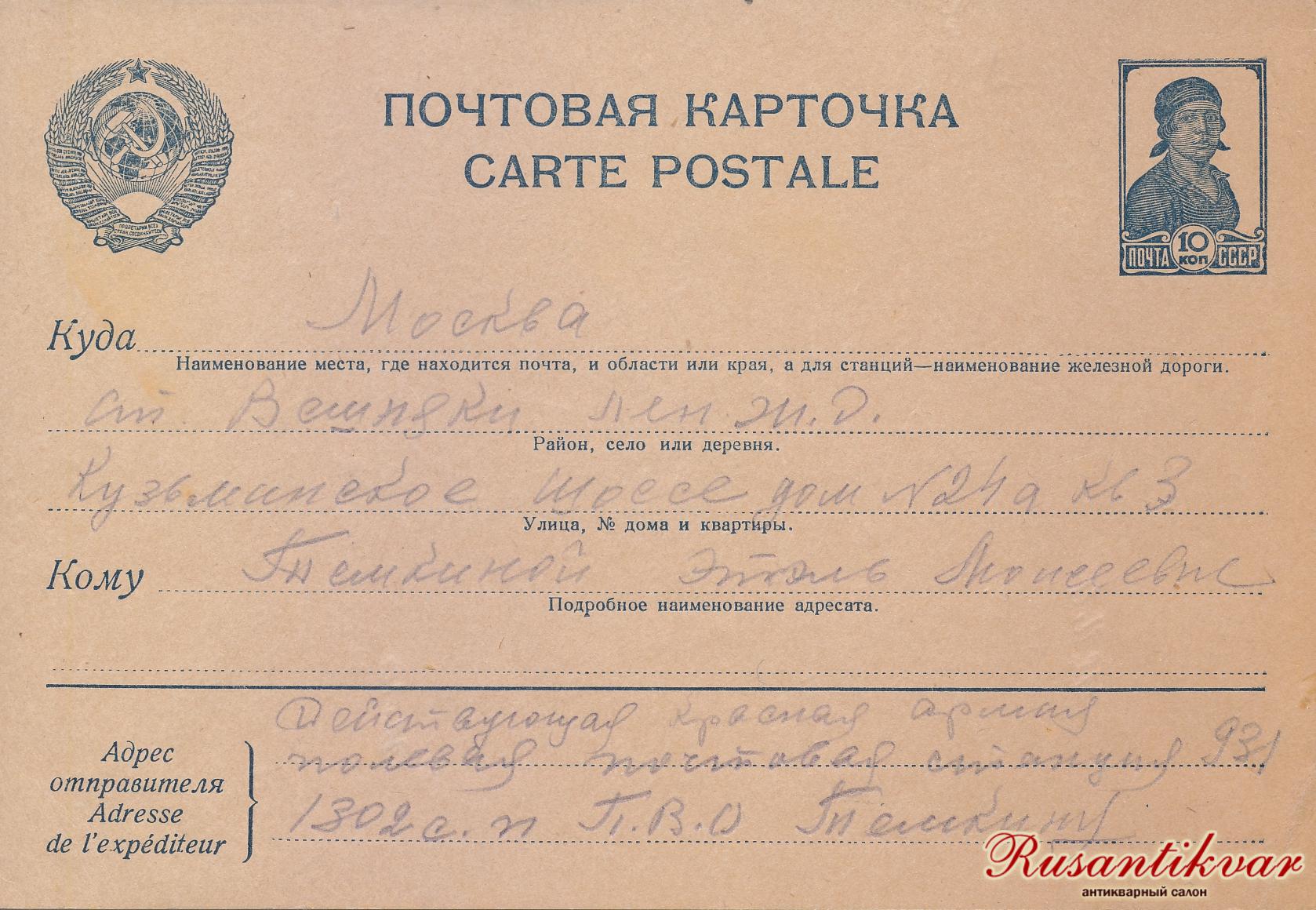 Адрес отправителя: Действующая Красная армия, Полевая почтовая станция 931, 1302 СП, П.В.О. Темкину
