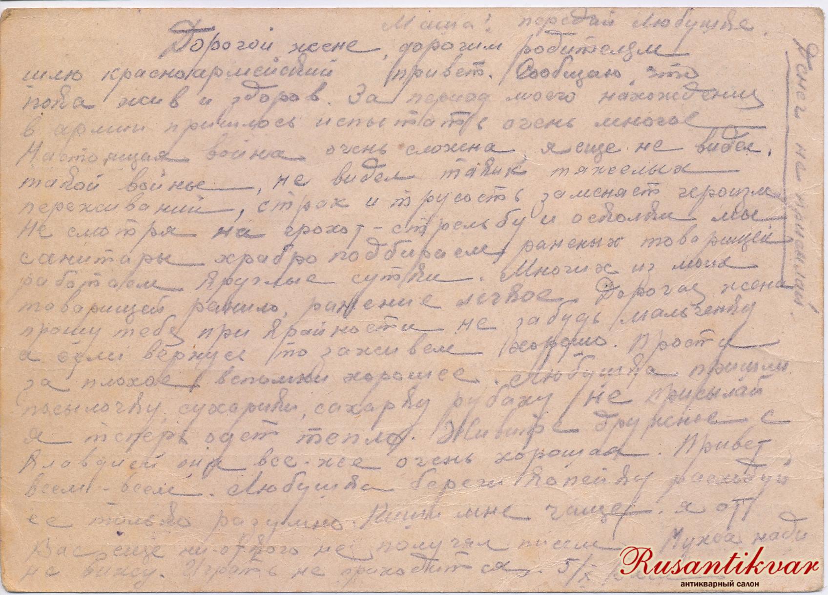 Дорогой жене, дорогим родителям шлю красноармейский привет. Сообщаю, что пока жив и здоров. За период моего нахождения в армии пришлось испытать очень многое. Настоящая война очень сложна, я ещё не видел такой войны, не видел таких тяжёлых переживаний, страх и трусость заменяет героизм. Несмотря на грохот – стрельбу и осколки, мы санитары, храбро подбираем раненых товарищей, работаем круглые сутки. Многих из моих товарищей ранило, ранение легкое. Дорогая жена, прошу тебя, при крайности не забудь мальчонку, а если вернусь, то заживем хорошо. Прости за плохое, вспомни хорошее. Любушка, пришли посылочку, сухарики, сахарку, рубаху не присылай, я теперь одет тепло. Живите дружно с Клавдией, она всё же очень хорошая. Привет всем-всем. Любушка, береги копейку, расходуй её только разумно. Пиши мне чаще, я от вас ещё ни от кого не получал писем. Мужа Нади не вижу. Играть не приходится. 5.Х. Вася. (приписка сбоку) Денег не присылай!»