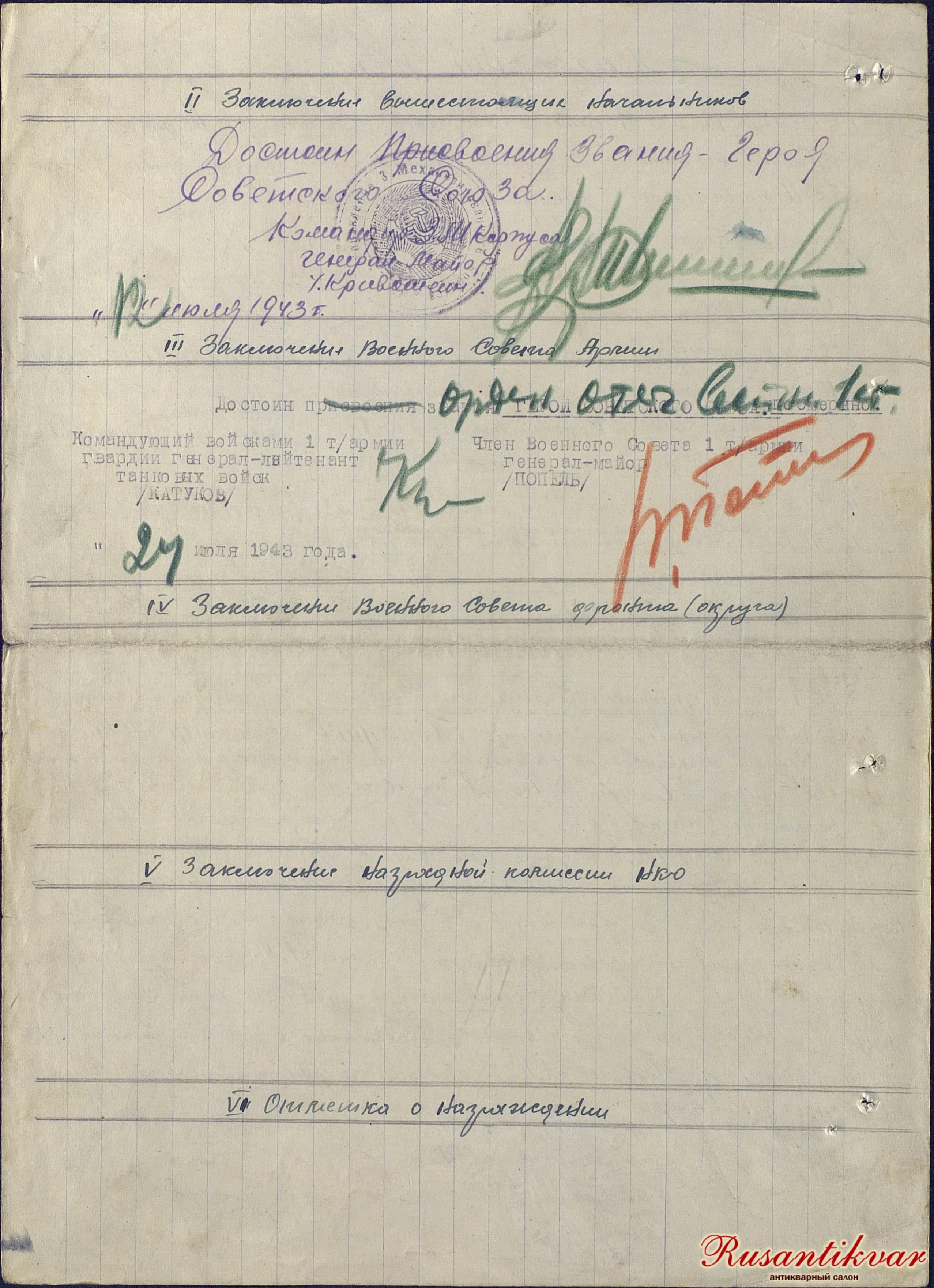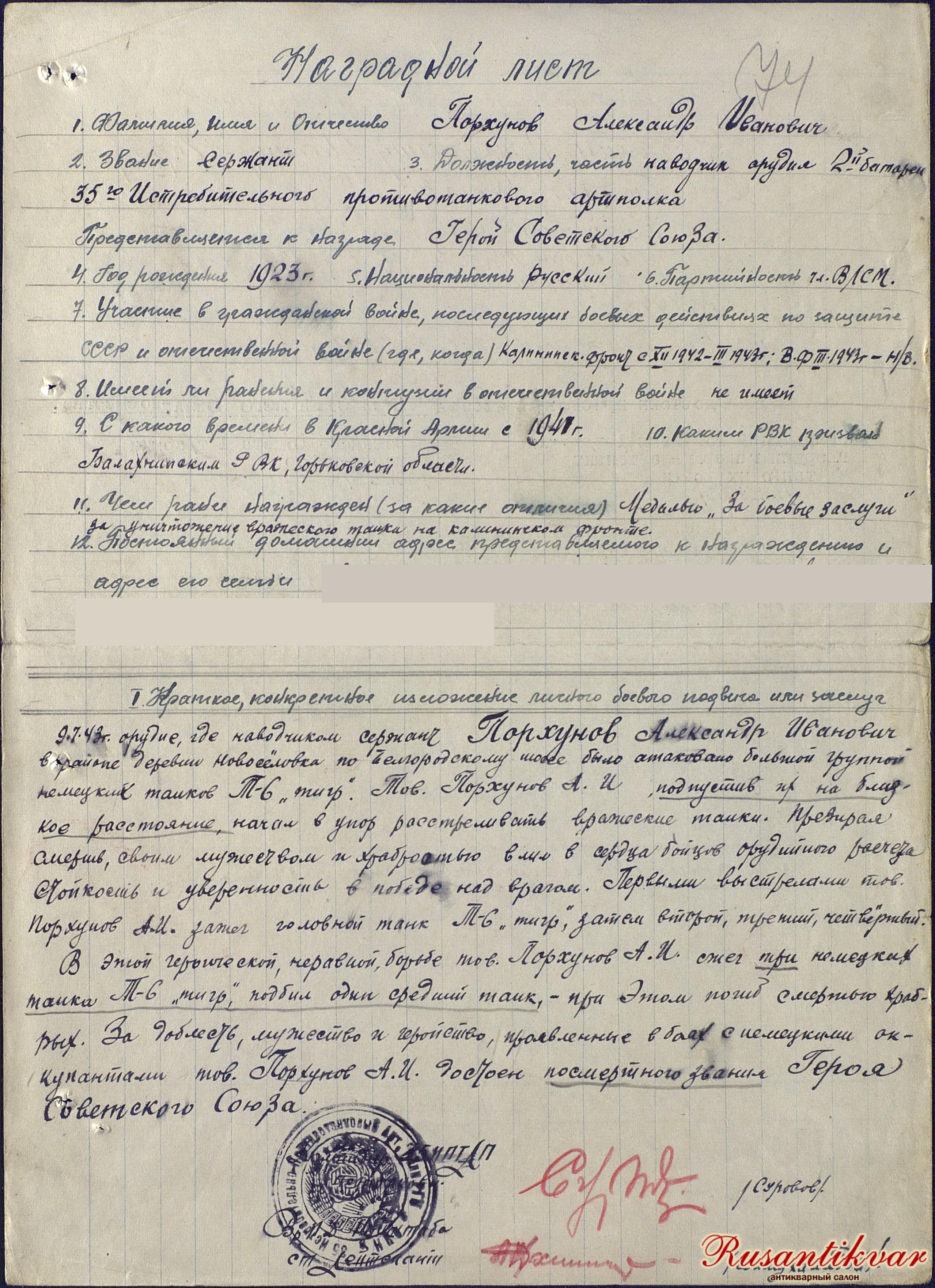 Наградной лист Порхунова А.И.