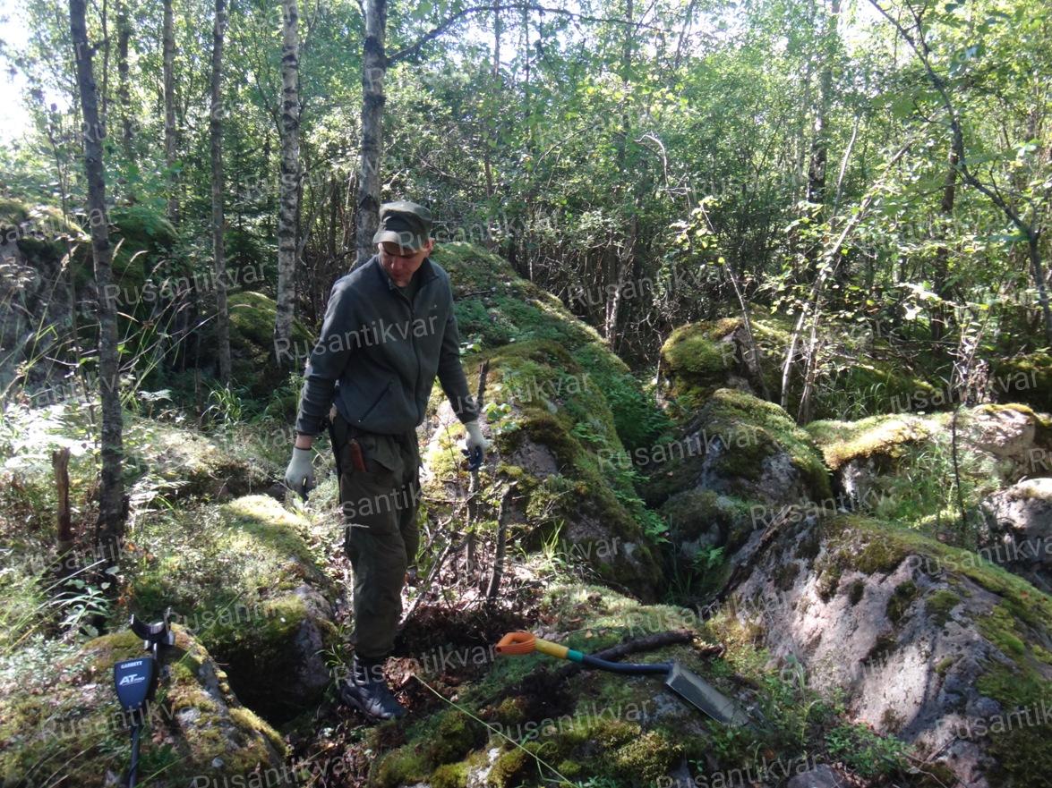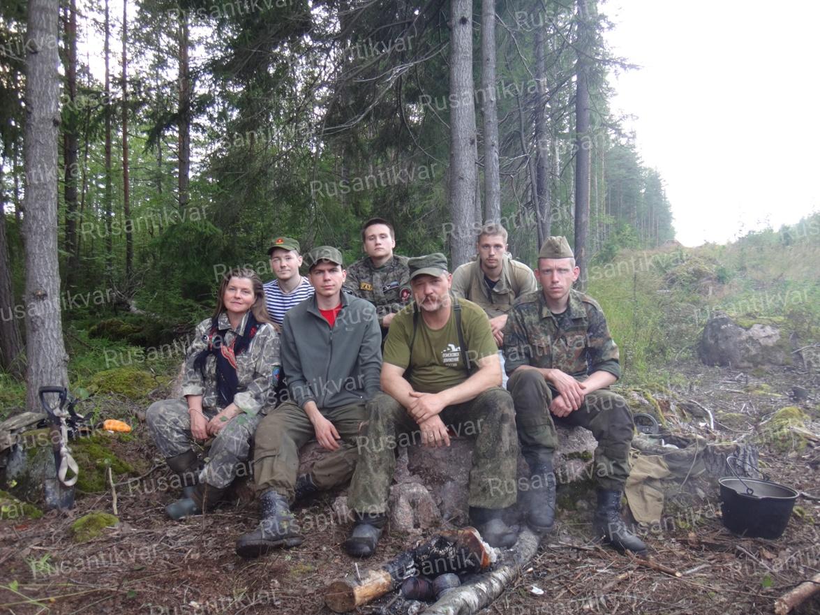 Сроки общей экспедиции подходили к концу, поэтому нам оставался всего один рабочий день, чтобы постараться завершить работы на месте падения самолёта. Выехали опять расширенным составом и в задачу этого дня наметили выкачать воду из небольшой воронки и проверить её дно. Относительно быстро в два ведра качнули воронку, выстроившись в небольшую цепочку. Глубина воронки оказалась совсем небольшой, а её дно представляло собой несколько здоровенных камней, на которые и пришелся основной удар мотора самолёта при падении. Среди раздробленных камней удалось извлечь сильно деформированный храповик с остатками дюралевого кока, один противовес от лопасти и много раздробленных силуминовых фрагментов от навесных агрегатов мотора. Пока мы занимались воронкой, остальные ребята продолжили расширять раскоп в радиусе разлета обломков самолёта. К сожалению, больших фрагментов и обломков самолёта так и не нашлось, что говорило о том, что скорее всего в послевоенные годы всё основное было сдано в металлолом, так как место падения самолёта находилось относительно недалеко от станции и поселка. Все находки, которые удавалось найти при помощи металлоискателей, ребята складывали на большой плоский валун, который находился рядом с воронкой и где был оборудован помывочный и очищающий центр. К этому моменту у меня уже сложилось окончательное мнение, что мы находимся и работаем на месте падения бомбардировщика ДБ-3 или Ил-4, и я уже в уме стал прикидывать, какие авиационные полки могли иметь потери самолётов в этом районе. Падение самолёта в период советско-финляндской войны 1939-1940 годов отметалось сразу, так как нами были обнаружены гильзы от авиационного крупнокалиберного пулемета УБ, изготовленные в 1941 году, да и фрагменты обмундирования лётчиков (а то, что мы находим фрагменты останков нескольких человек, уже ни у кого не вызывало сомнения) были летнего покроя. Значит, самолёт потерян в период Великой Отечественной войны 1941-1945 годов.