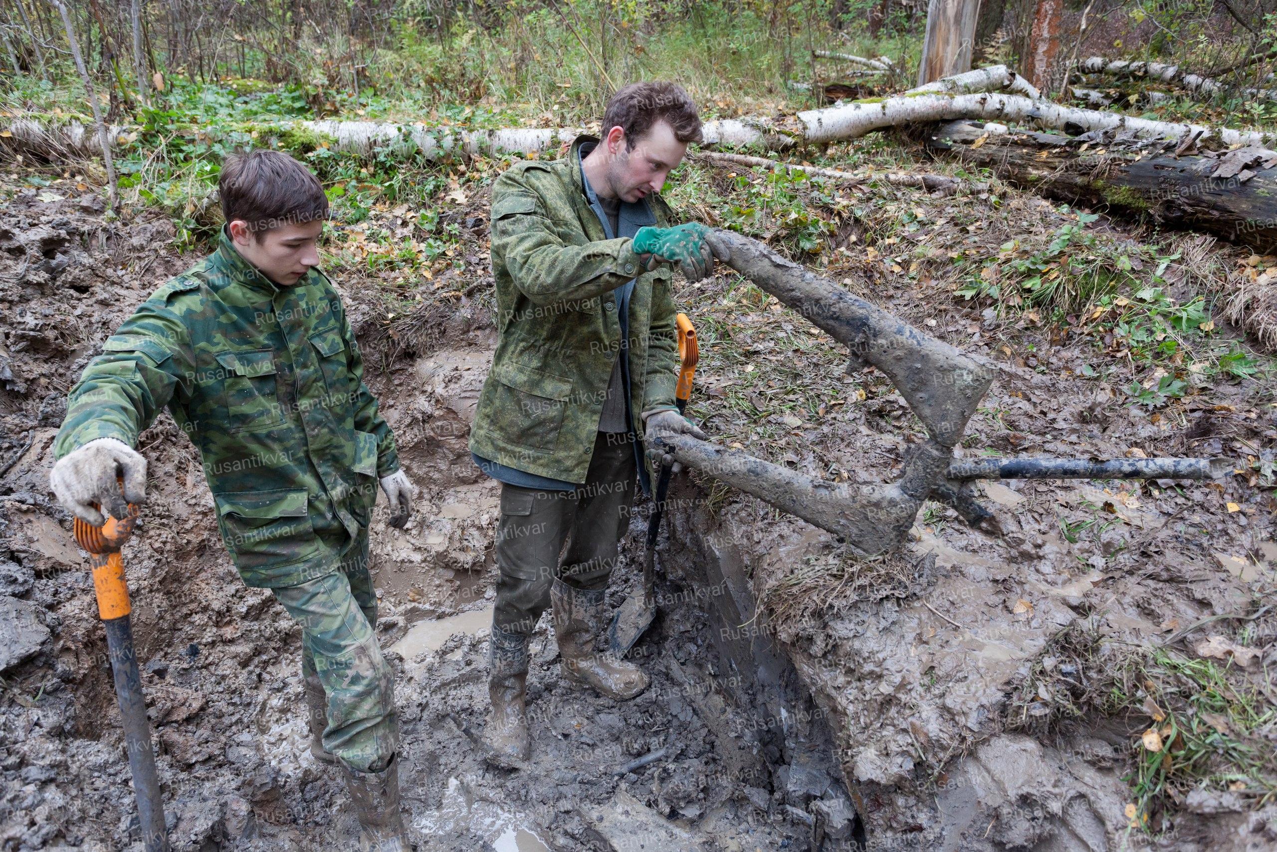 На глубине около метра обломки пошли сплошным слоем, а пространство между ними было заполнено водой. В основном встречались фрагменты обшивки, конструкции рамы, трубки и шланги. Среди этого стали встречаться фрагменты одежды в очень хорошей сохранности, а также не разложившаяся органика от тела погибшего, зажатая между деформированными обломками. Но количество останков было не значительное – тела погибших были извлечены ранее. Стало понятно, что здесь поработали вскоре после катастрофы. В первый день раскопок нашлись и долгожданные номера мотора М-105 на фрагменте крышки распределительного вала и обломке магнето. Один номер читался чётко – К 25-31, а второй был перебит с 25-77 на 25-37. Мы решили, что это номер второго мотора, но впоследствии это не подтвердилось.