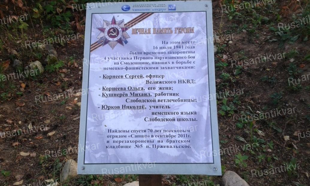 После долгих и усердных поисков 5 сентября 2011 года поисковым отрядом Сапшо под руководством Максима Колчина было найдено место захоронения 4-х участников первого партизанского боя на Смоленщине, а именно: Сергея Корнеева, его жены Ольги, Николая Юркова и Михаила Кушнерева. Имена погибших были установлены по найденным именным часам Корнеева и рабочей сумки с циркулем Юркова. Личность Ольги Корнеевой установили по форме черепа.