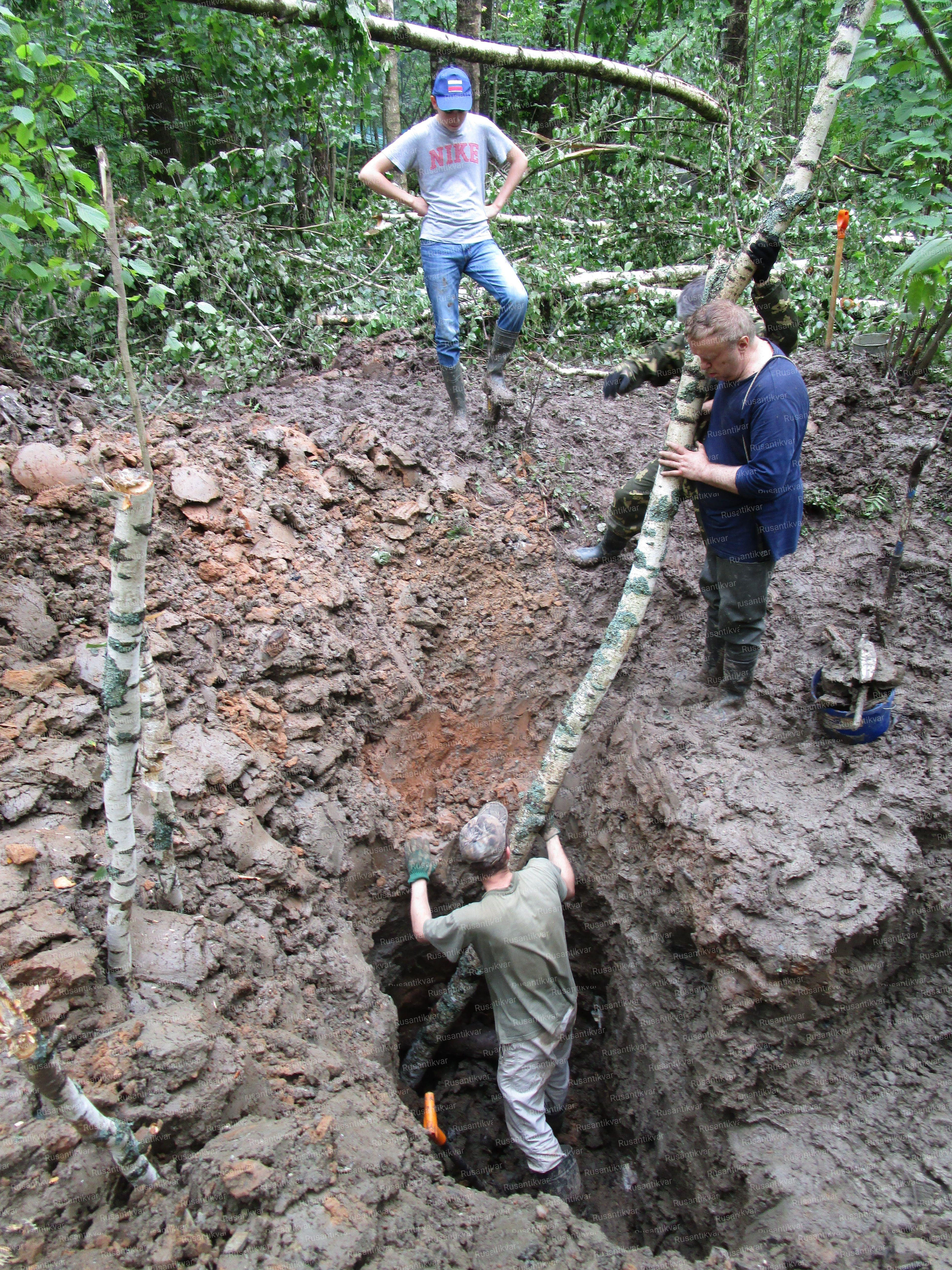 Раскопки перешли в южную часть воронки, где в землю врезался второй мотор самолёта. Не исключалась возможность наличия информативных находок и в этом месте, которые могли бы добавить новых подробностей. Уже на глубине 1 метр из земли показались крупные обломки, обгоревшие и оплавленные. Глина в этом месте была спёкшаяся и окаменевшая при высокой температуре горения. Вместе с фрагментами самолёта найден согнутый лом и обрывок стального троса, оставленные нашими предшественниками, которые бросили работу и не стали продолжать раскопки. Было понятно, что под нашими ногами в раскопе находится не тронутый левый мотор бомбардировщика. Было принято решение извлечь мотор и вывезти его с целью пополнения музейной экспозиции поискового отряда. Однако для осуществления этой задачи требовалось дополнительное техническое оборудование. Экспедиция прервалась на некоторое время, и по мере наличия всего необходимого.
