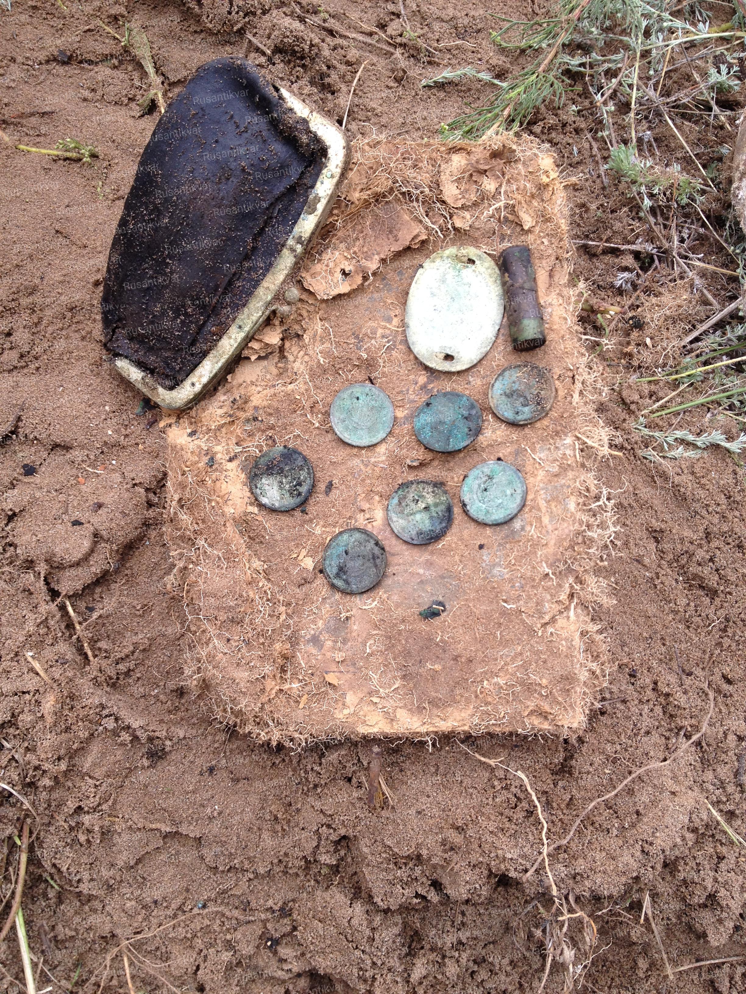 Содержимое кошелька – ЛОЗ японского военнослужащего, личная факсимильная печать, монеты Манчжоу-Го и Японии. У многих японцев в кошельках была пуля. Использовалась, видимо, как талисман, который им так и не помог.