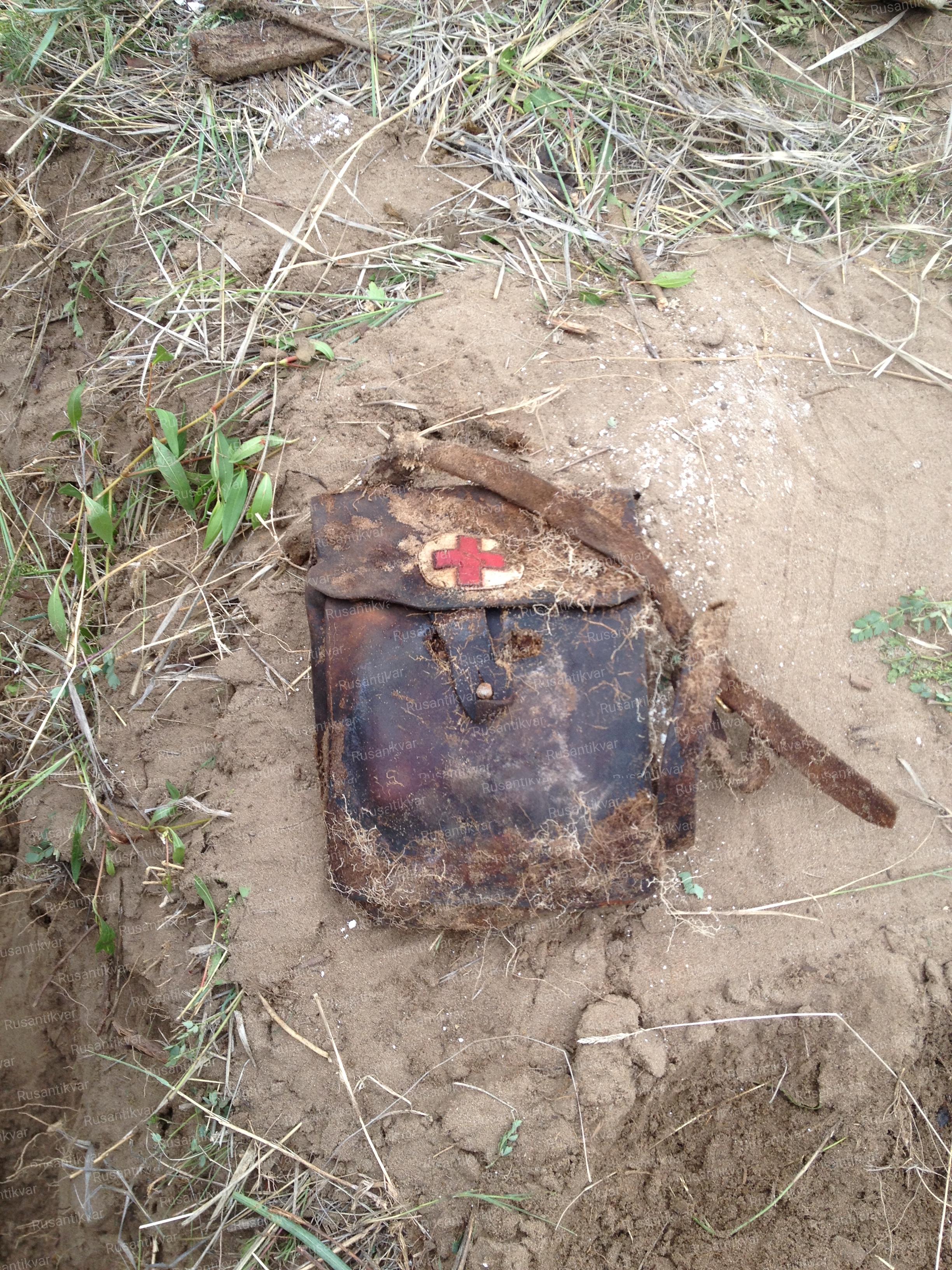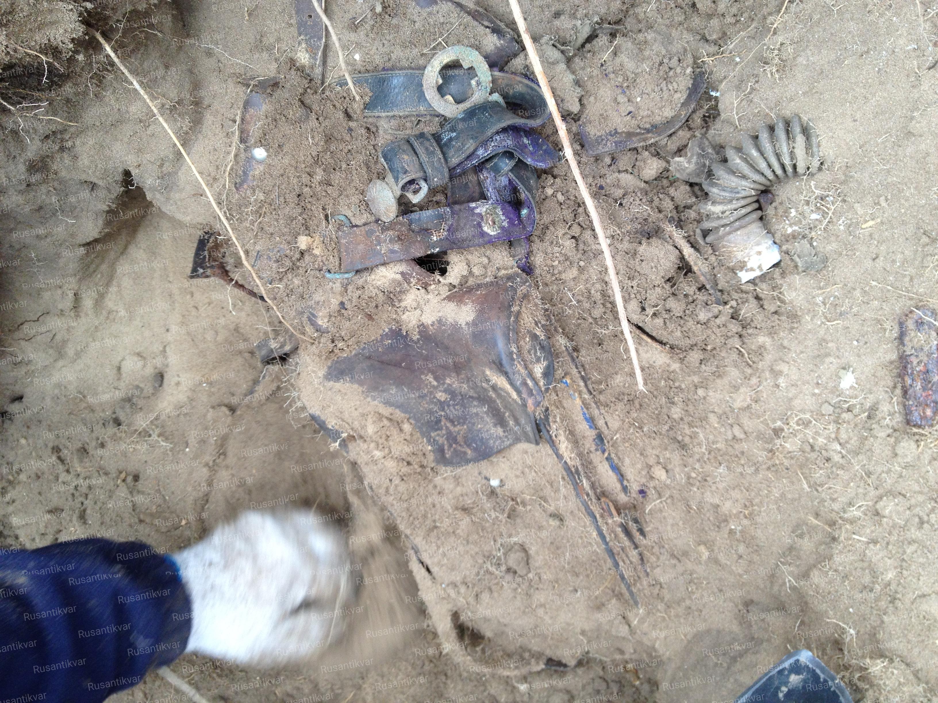 Личные вещи одного из бойцов. Карманные серебряные часы, мундштук, расческа, ключ, ремень, подсумок. Что сразу бросилось в глаза – очень много кожаного обмундирования у наших солдат. В наших широтах такое встречается только по 1941 году. Местной особенностью является проблема с идентификацией солдат – только подписанные предметы. Но, как оказалось, солдаты подписывали не только котелки и фляги, но и ремни, и подсумки.