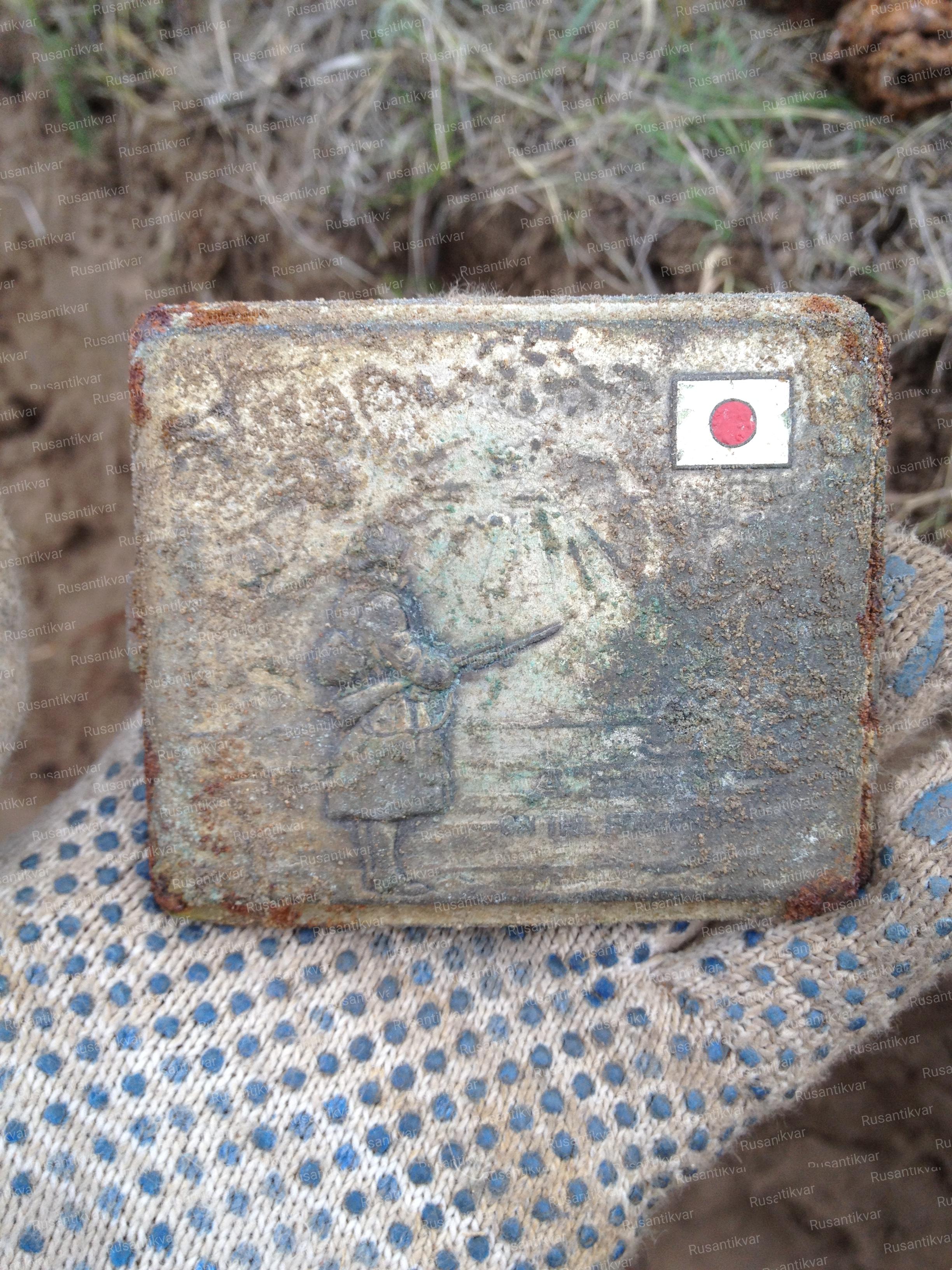 Портсигар с изображением солдата на фоне Фудзиямы. Лежал у японца в каске. Когда достали из каски череп – портсигар выпал к нашим ногам. Открыли портсигар и обомлели – внутри была фотография, где ещё читался облик женщины. С обратной стороны фото было подписано иероглифами.