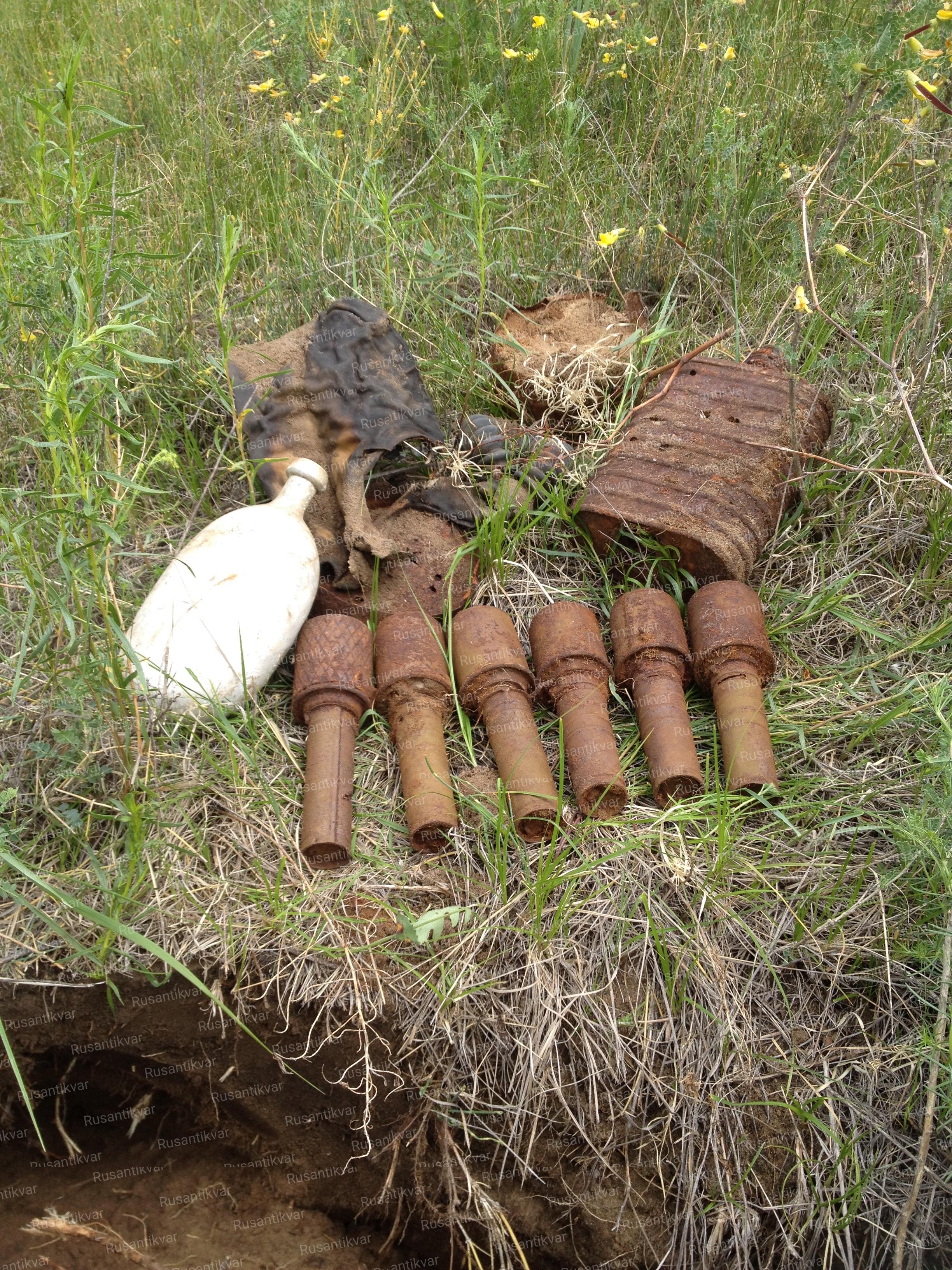 Начало работ – высота Зеленая. Удивительно, что на Халхин-голе лучше всего сохраняются верховые предметы. Ранние гранаты РГД-33 в «родной» краске, граната Рдултовского обр 1914/30 года. Крайняя справа – японская мина 50-мм от ручного («коленного») миномета Тип 89.