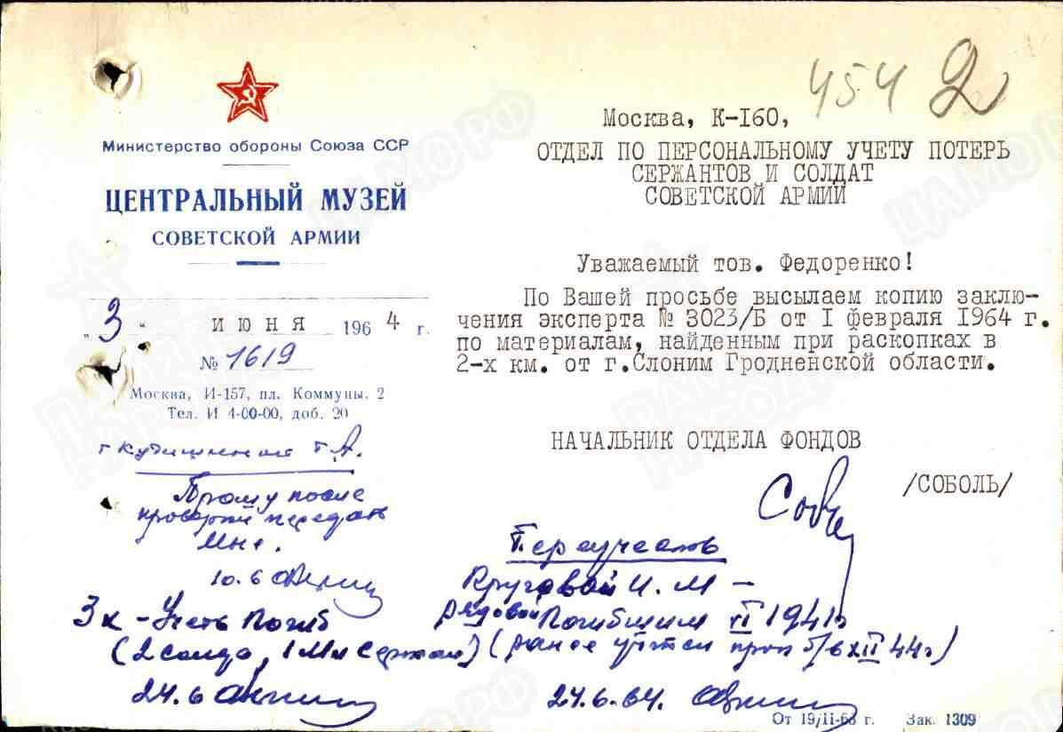 Приведём выдержку из книги Дмитрия Егорова «Июнь 1941 Разгром Западного фронта»: «В ноябре 1963 г. в 2 км от станции Слоним у шоссе Зельва — Слоним были обнаружены останки советских военнослужащих. Удалось установить фамилии семи бойцов из этого захоронения. Вместе с останками были найдены пять мастичных и три резиновых печати. На мастичных печатях отчетливо прочитывались надписи и номер войсковой части (7488), изображение герба СССР и номеров печатей. В/ч 7488 — это 64-й отдельный мотоинженерный батальон 11-го механизированного корпуса, до войны он стоял в Волковыске, оттуда выступил на фронт. У кого хранится гербовая печать части? Обычно у её командира или начальника штаба» .