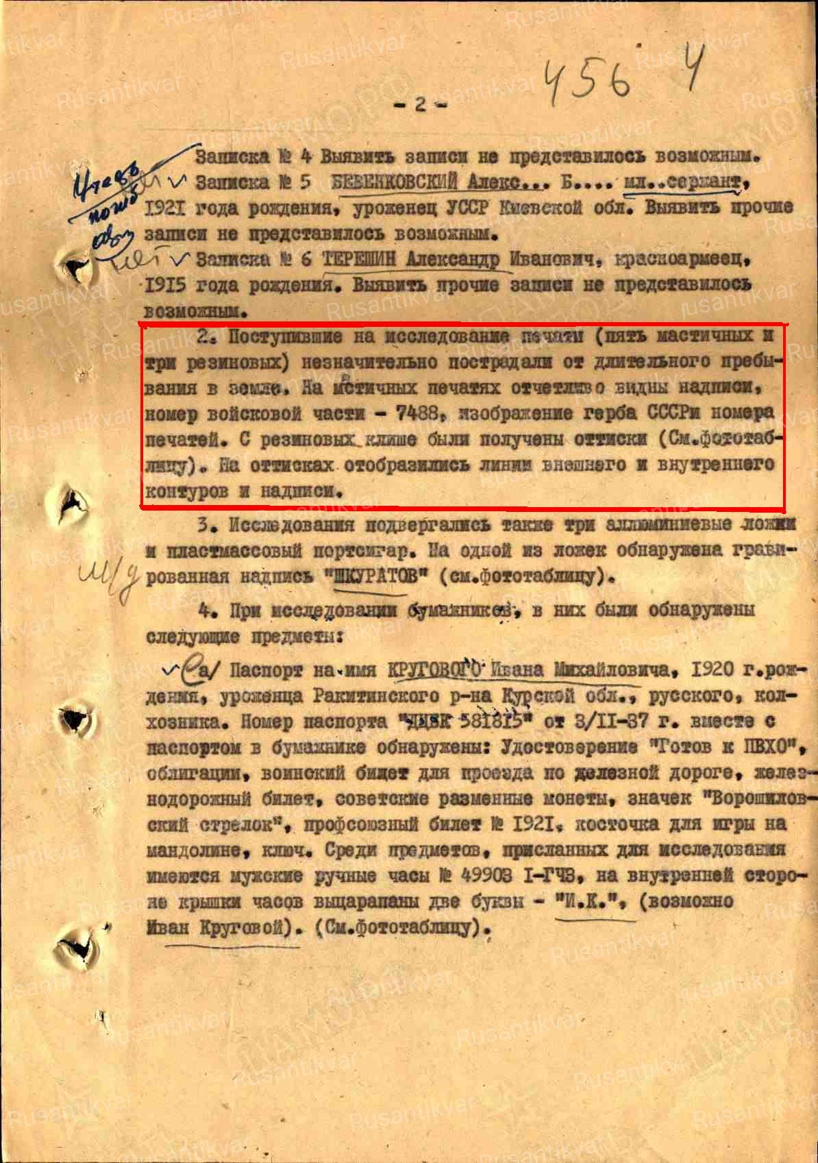 С резиновых клише были получены оттиски. На оттисках отобразились линии внешнего и внутреннего контуров и надписи – найдены на останках погибшего офицера. Печати были переданы в Слонимский РВК и оттуда направлены в Москву на экспертизу. В настоящее время местонахождение печатей не установлено.(Сканы 00, 01, 02, 03).